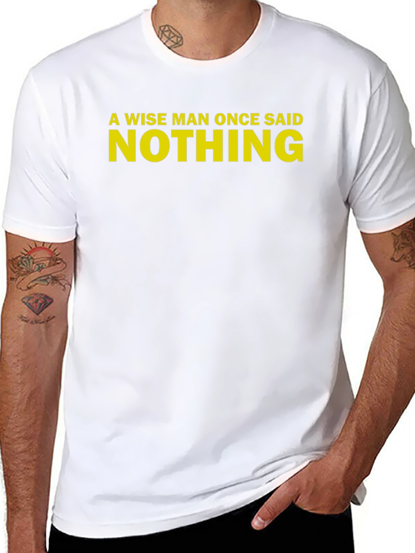 This classic black t-shirt features the amusing quote "A Wise Man Once Said NOTHING" in bold yellow lettering. Made from a comfortable-looking fabric, this tee is perfect for casual wear and expressing your humorous side. The short-sleeve design makes it ideal for warmer weather or layering under a jacket. It's a great conversation starter and a fun addition to any wardrobe. Wear it to a casual gathering, while running errands, or just lounging at home. The simple design ensures it pairs well with jeans, shorts, or even a skirt. A unique and stylish way to show off your wit and wisdom!
