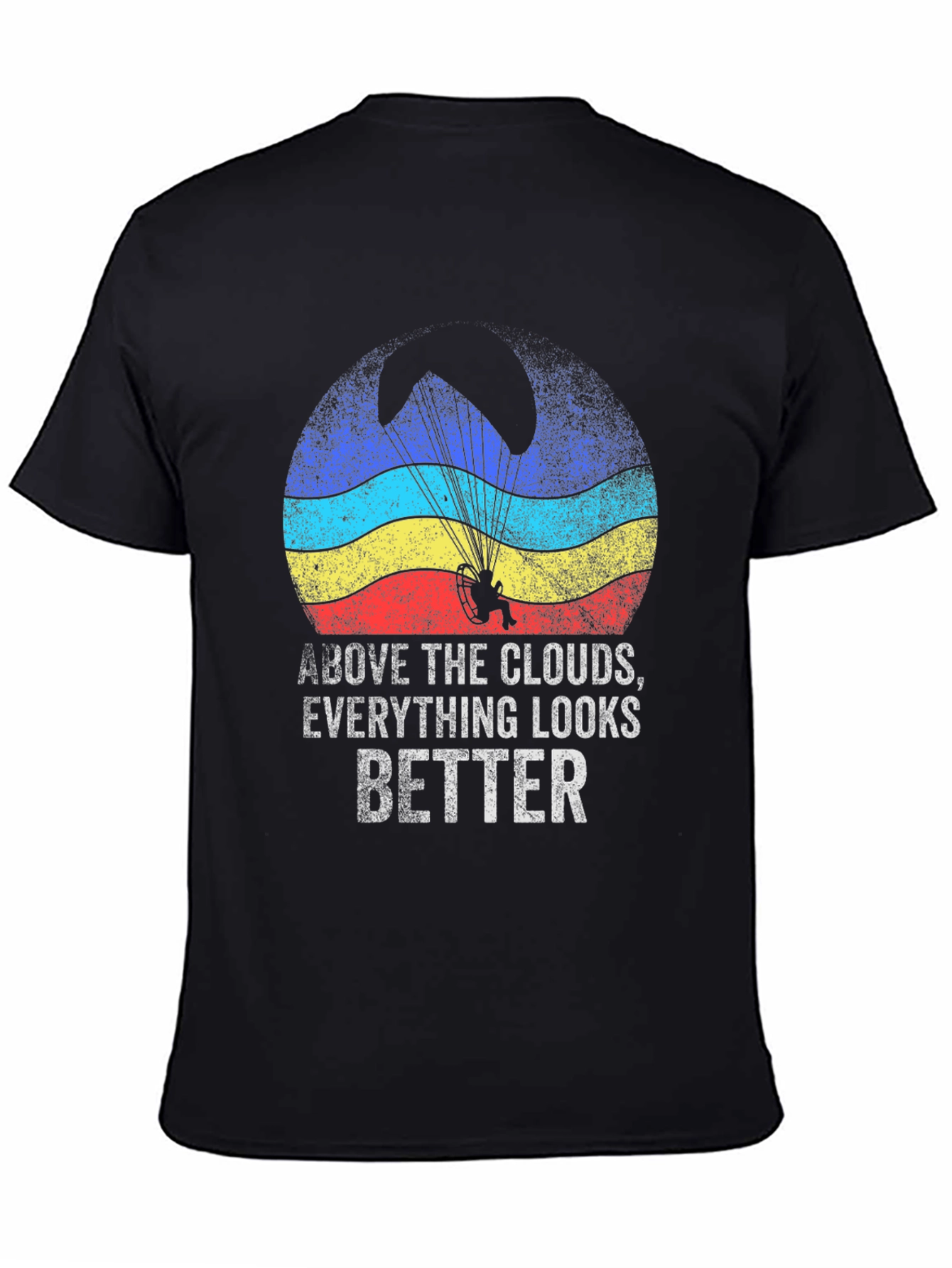 This black t-shirt features a vintage-inspired graphic design with the phrase "Above the Clouds, Everything Looks Better." The graphic includes a paraglider against a colorful, striped circular backdrop. The distressed print gives it a cool, retro feel. Made from a comfortable-looking fabric, this tee is perfect for casual wear. Show off your adventurous spirit or appreciation for inspirational sayings with this unique and stylish t-shirt. Ideal for everyday wear, outdoor activities, or as a gift for aviation enthusiasts.
