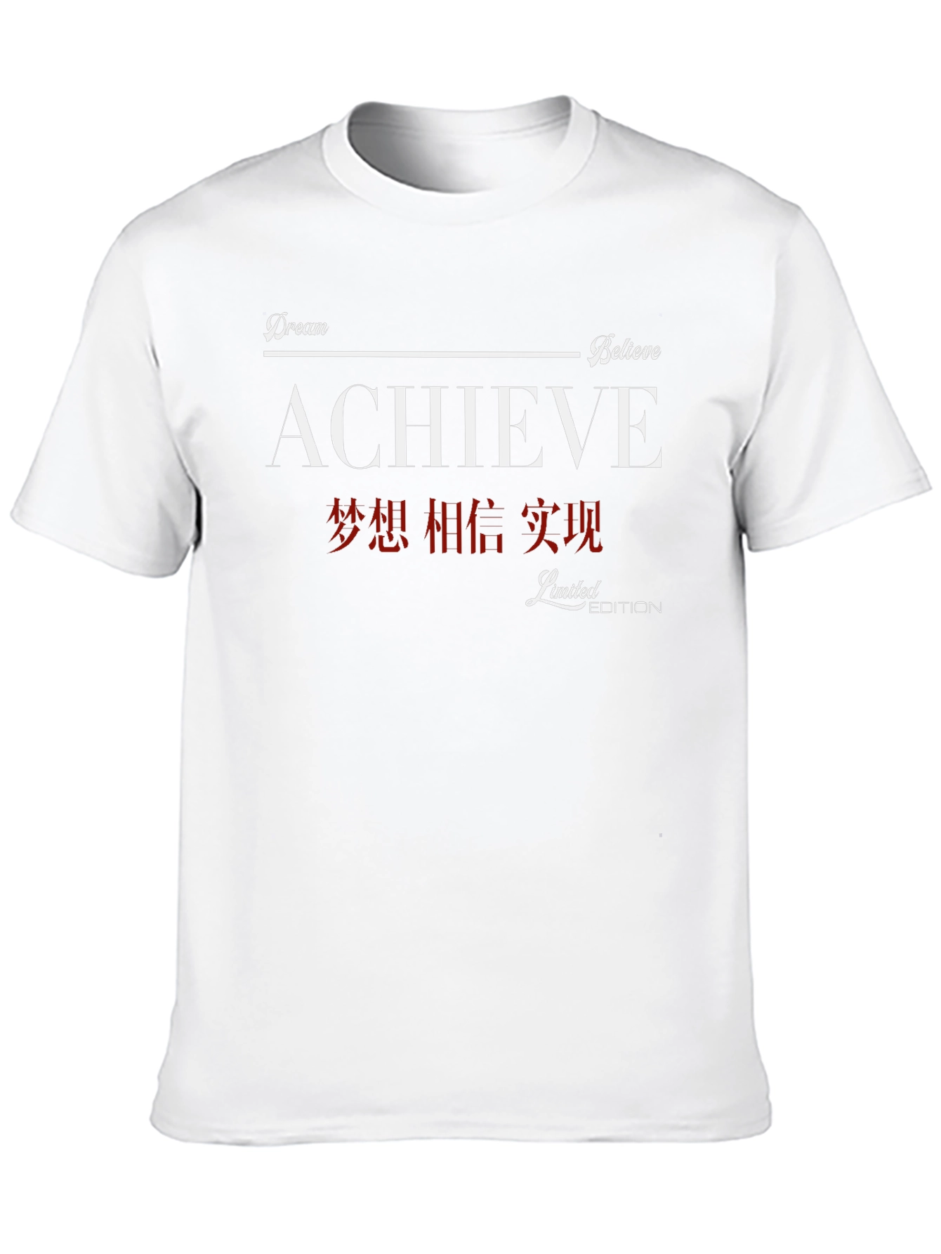 This stylish black t-shirt features a bold design with the word "ACHIEVE" prominently displayed. Above this, the words "Dream" and "Believe" are subtly printed, connected by a thin white line. Below "ACHIEVE" is a phrase in a different language, possibly Chinese, adding an international touch. The words "Limited Edition" in a cursive font are printed on the lower right corner. The shirt appears to be made from a comfortable, breathable fabric, making it ideal for casual wear. Its motivational message and sleek design make it a great choice for anyone looking to express their ambition and positive mindset. Perfect for everyday wear, workouts, or casual outings.