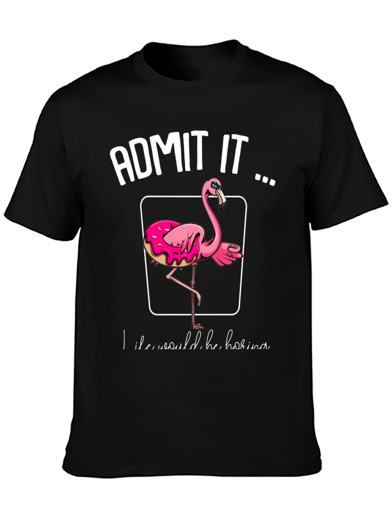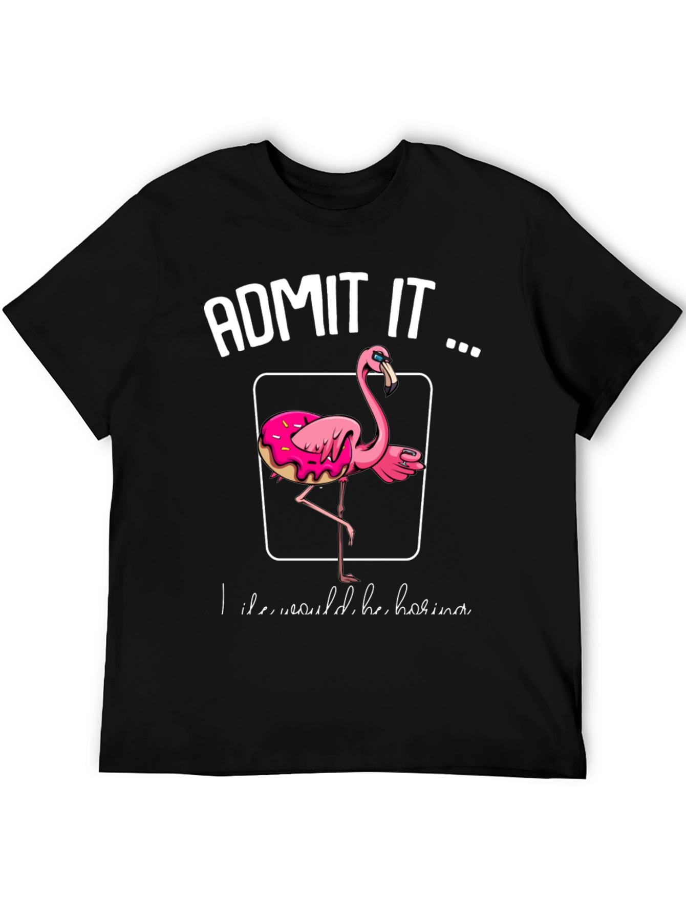 This stylish black t-shirt features a fun graphic design. The shirt prominently displays the phrase "ADMIT IT ..." above a square outline enclosing a pink flamingo with a donut around its body. The unique design is eye-catching and sure to spark conversation. Made from a comfortable-looking fabric, this tee is perfect for casual wear. Whether you're a flamingo lover, a donut enthusiast, or just appreciate quirky fashion, this shirt is a great way to express your personality and add a touch of humor to your wardrobe. Its classic fit makes it versatile for everyday outfits.