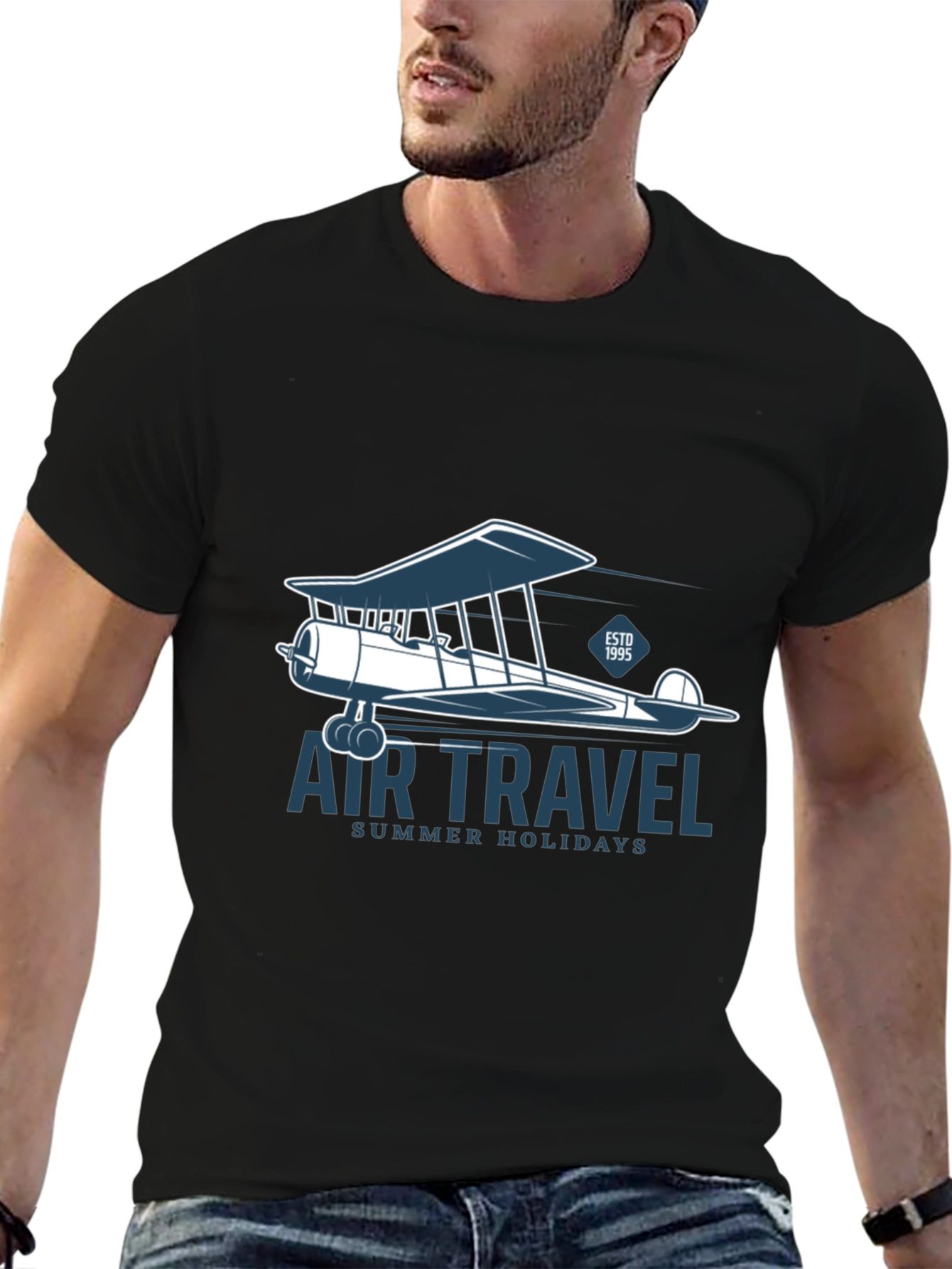 Soar into summer with this stylish black t-shirt featuring a vintage-inspired airplane design. The graphic showcases a classic biplane, accompanied by the words 'AIR TRAVEL' and 'SUMMER HOLIDAYS', perfect for travel enthusiasts and vacation lovers. The 'ESTD 1995' detail adds a touch of history. Made from comfortable, breathable fabric, this tee is ideal for casual outings, holiday adventures, or simply expressing your love for aviation. Pair it with jeans or shorts for a relaxed, cool look. Show off your passion for travel with this unique and eye-catching tee!