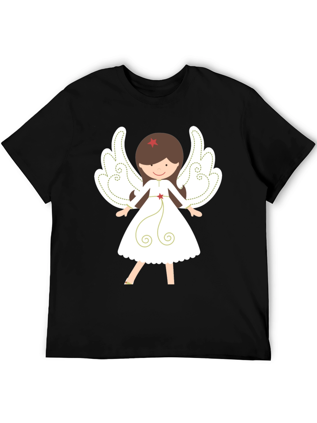 Spread holiday cheer with this adorable angel graphic tee! This black t-shirt features a charming cartoon angel design in the center. The angel has brown hair, a white dress with green swirl accents, and delicate white wings outlined in green stitching. A red star accents her hair and dress. Perfect for casual wear during the holiday season, Christmas parties, or simply to express your love for all things festive. Made from a comfortable-looking material, this tee is sure to become a favorite in your wardrobe. Show off your festive spirit with this unique and eye-catching t-shirt!