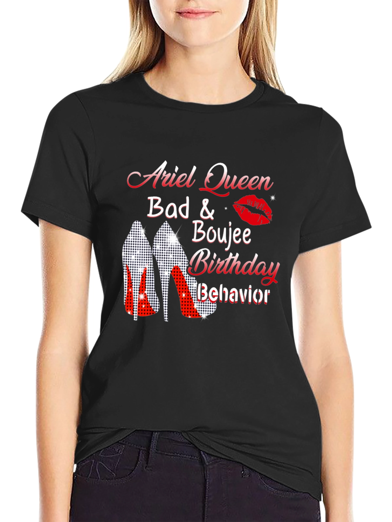 Show off your fabulous side with this unique graphic tee! The design features the phrase "Ariel Queen, Bad & Boujee, Birthday Behavior" in a stylish font, complemented by a bold lip graphic and sparkling heels. Made from comfortable, breathable fabric, this shirt is perfect for birthday celebrations or any occasion where you want to make a statement. Pair it with jeans, shorts, or a skirt for a chic and trendy look. Express your confidence and style with this eye-catching t-shirt!