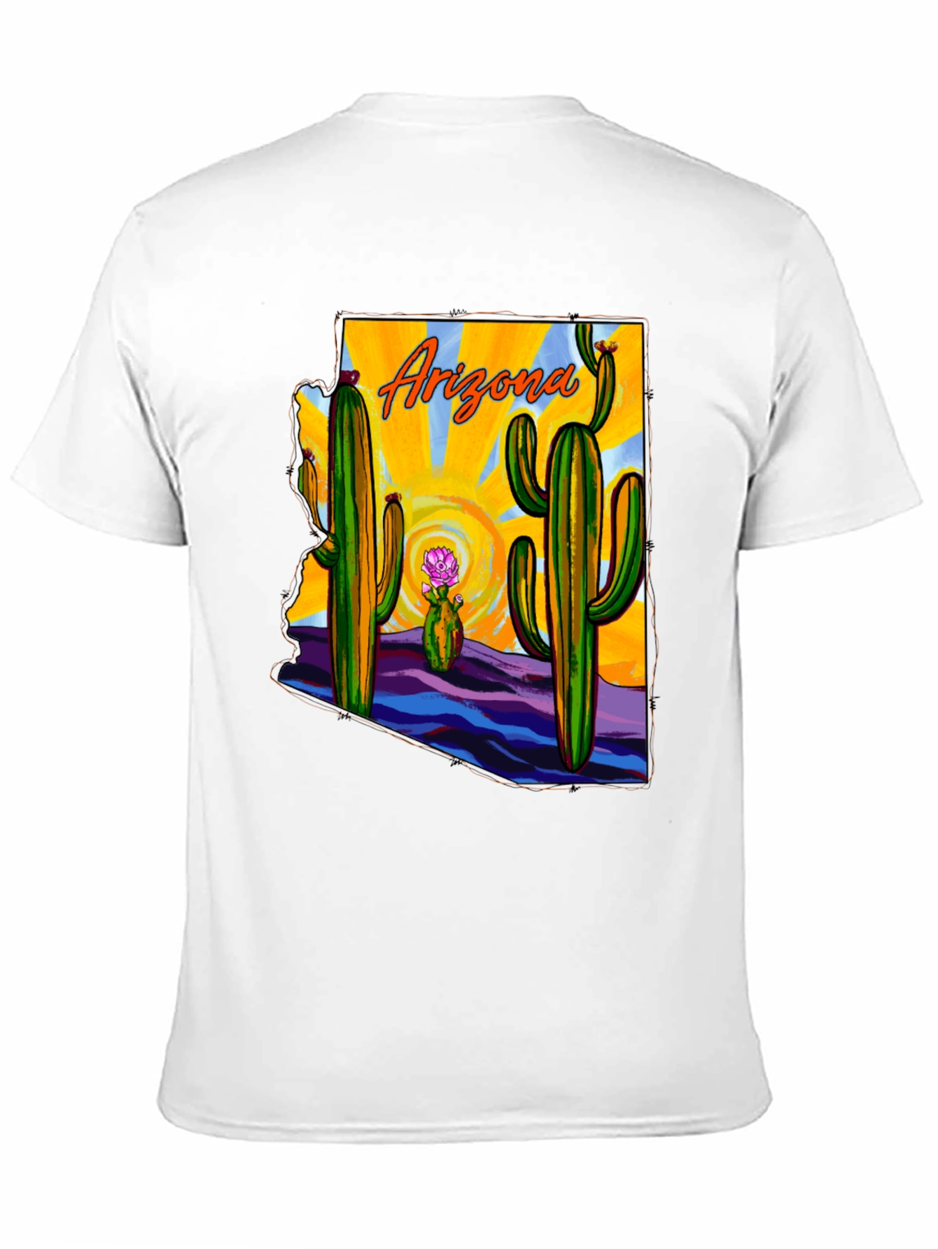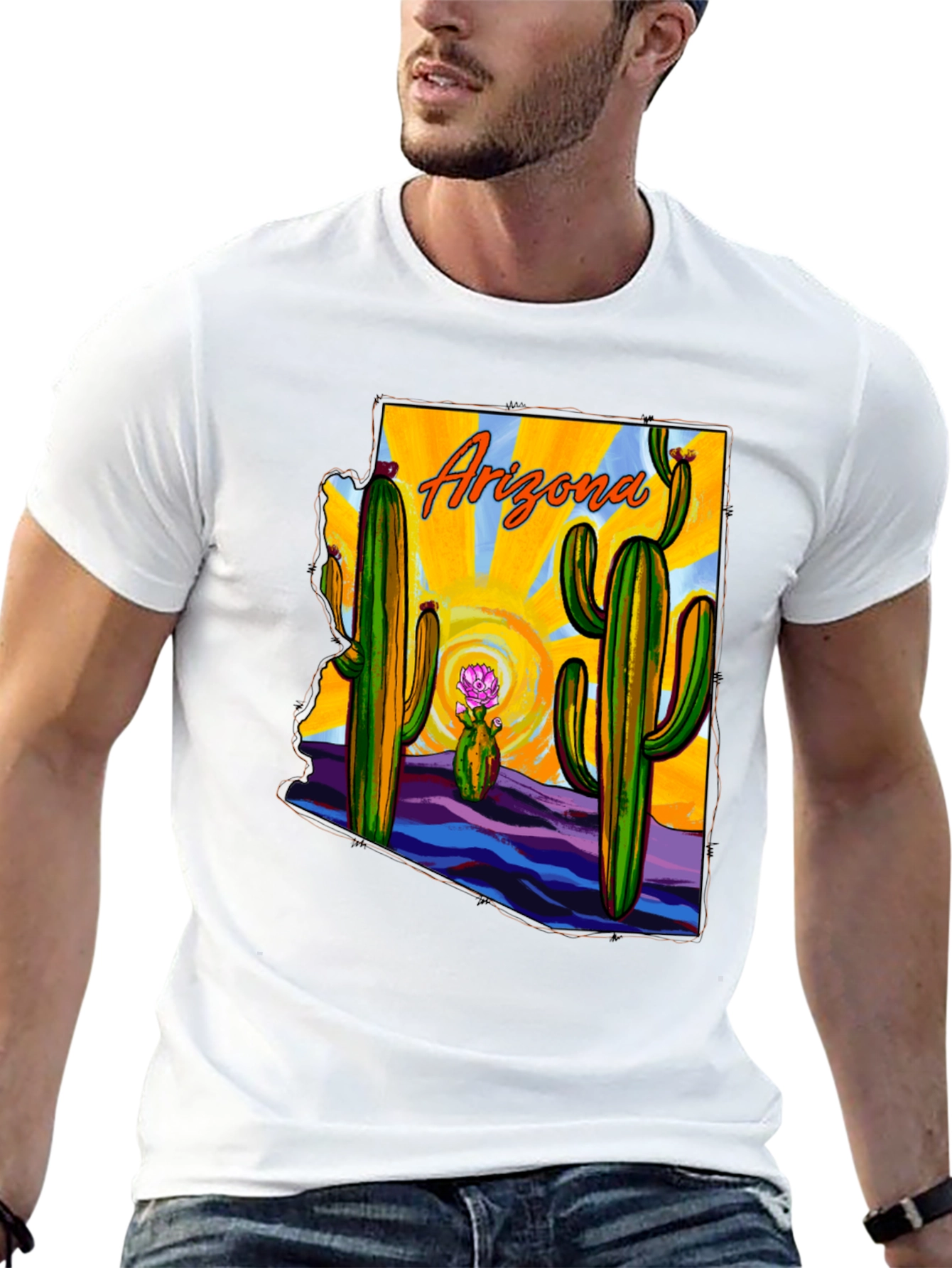 Showcase your love for the Arizona with this unique graphic T-shirt. The shirt features a vibrant design of the state's iconic desert landscape, complete with cacti, a bright sun, and "Arizona" written across the top. The colorful graphic contrasts beautifully against the solid black background of the tee. Made from a comfortable fabric, this tee is perfect for everyday wear. Whether you're exploring the outdoors or simply relaxing at home, this T-shirt is sure to make a statement. An ideal gift for Arizona natives, travelers, and nature lovers.