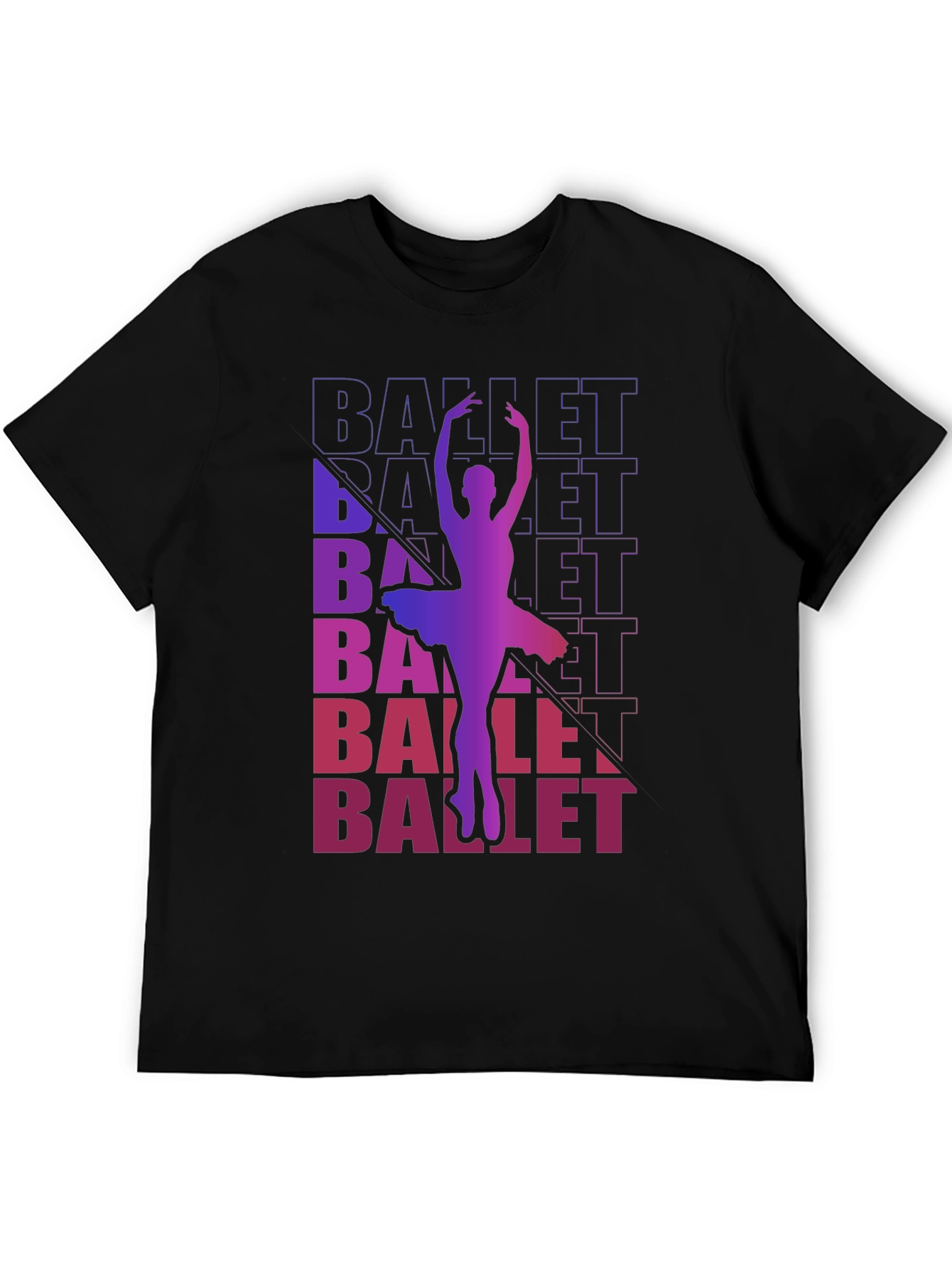 Show off your passion for dance with this stylish black graphic tee. The shirt features a vibrant, gradient-colored silhouette of a ballerina en pointe, layered over the repeating word "BALLET." This eye-catching design is perfect for dancers, ballet enthusiasts, or anyone who appreciates elegant artistry. Made from a comfortable, breathable fabric, this t-shirt is ideal for everyday wear, dance class warm-ups, or casual outings. Make a statement and express your love for ballet with this unique and fashionable tee. It also makes a thoughtful gift for the dancer in your life.