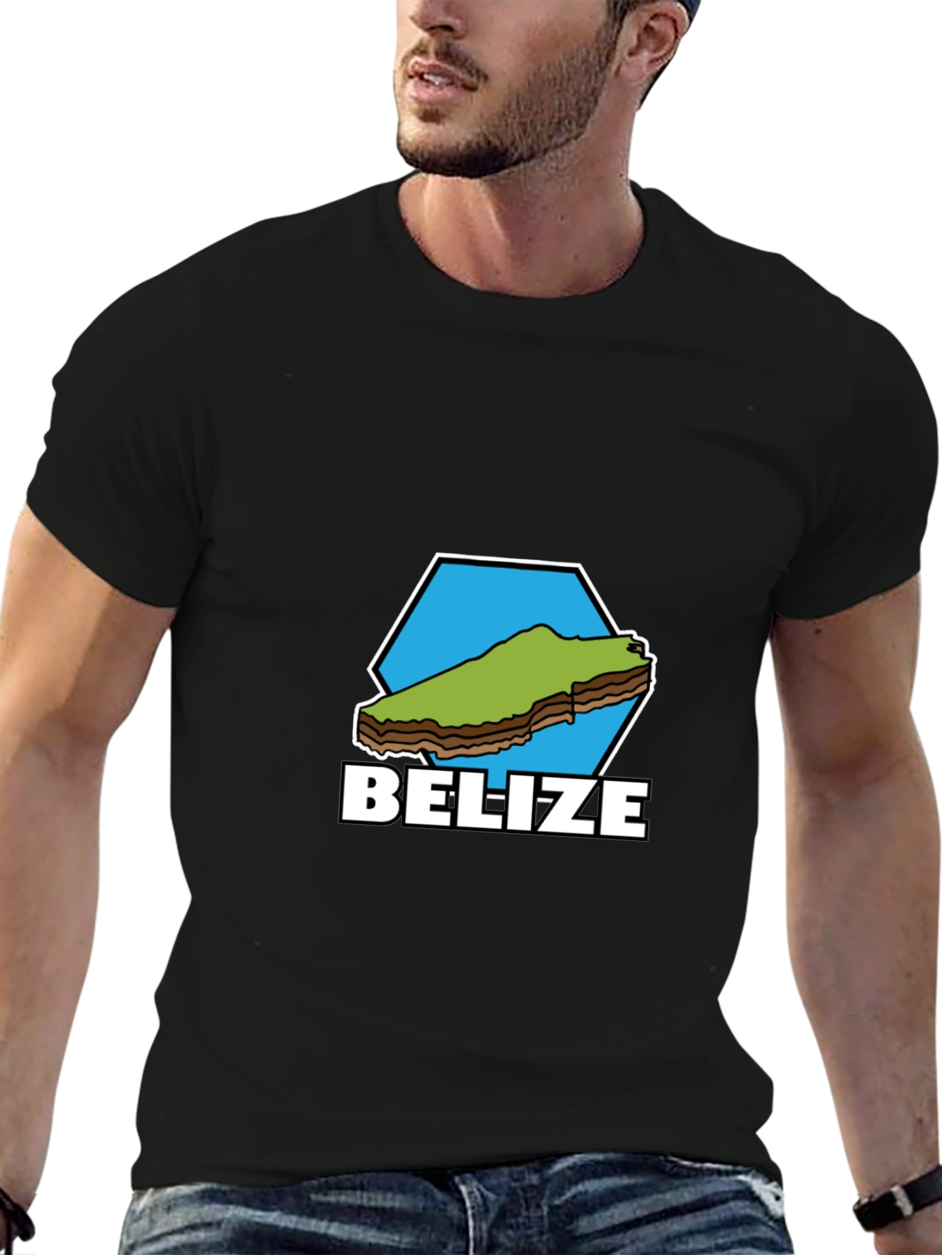 Show your love for Belize with this stylish black t-shirt. Featuring a unique graphic design of the country's map inside a blue hexagon, along with the word "BELIZE" in bold white letters. This tee is made from comfortable material, perfect for everyday wear. Ideal for travelers, residents, or anyone proud of their Belizean heritage. It's a great conversation starter and a unique way to display your connection to this beautiful country. A perfect addition to your casual wardrobe or a thoughtful gift for a Belize enthusiast.