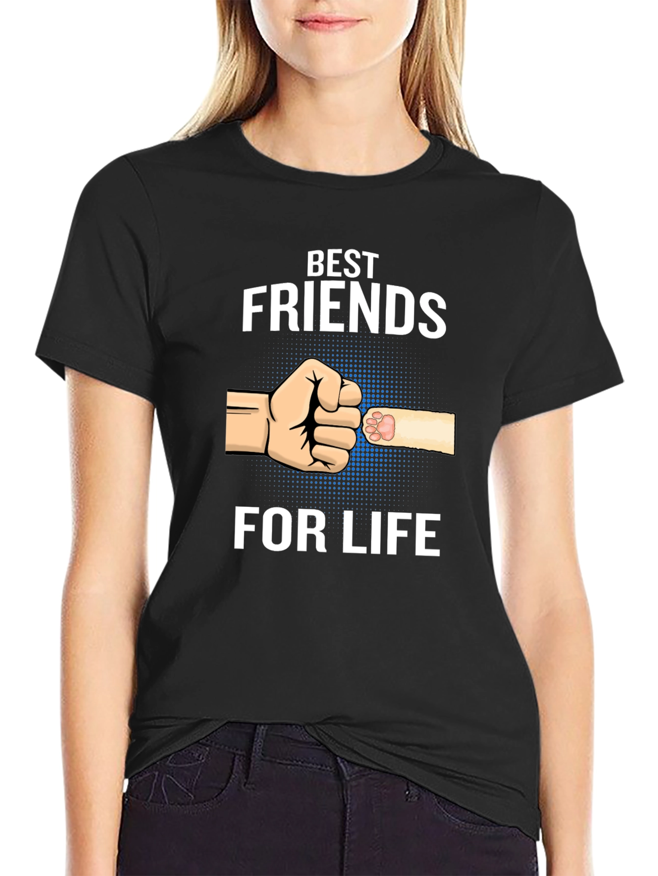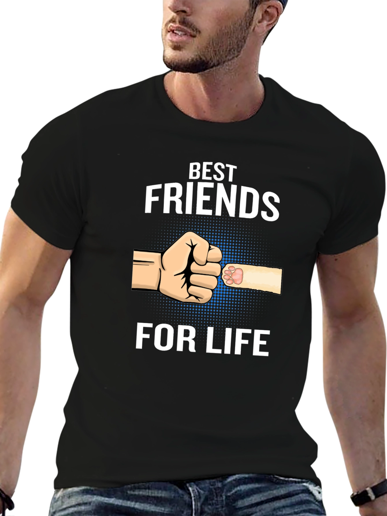 Show your love for your furry friend with this black T-shirt featuring the design 'Best Friends For Life'. The design includes a fist-bump graphic of a human fist and a paw, set against a dotted blue background. This T-shirt is perfect for animal lovers, cat owners, or anyone who cherishes the special bond between humans and their pets. It's a comfortable and stylish way to express your affection for your beloved companion. Made from soft, breathable fabric, it's ideal for casual wear and everyday activities. A great gift idea for pet lovers!