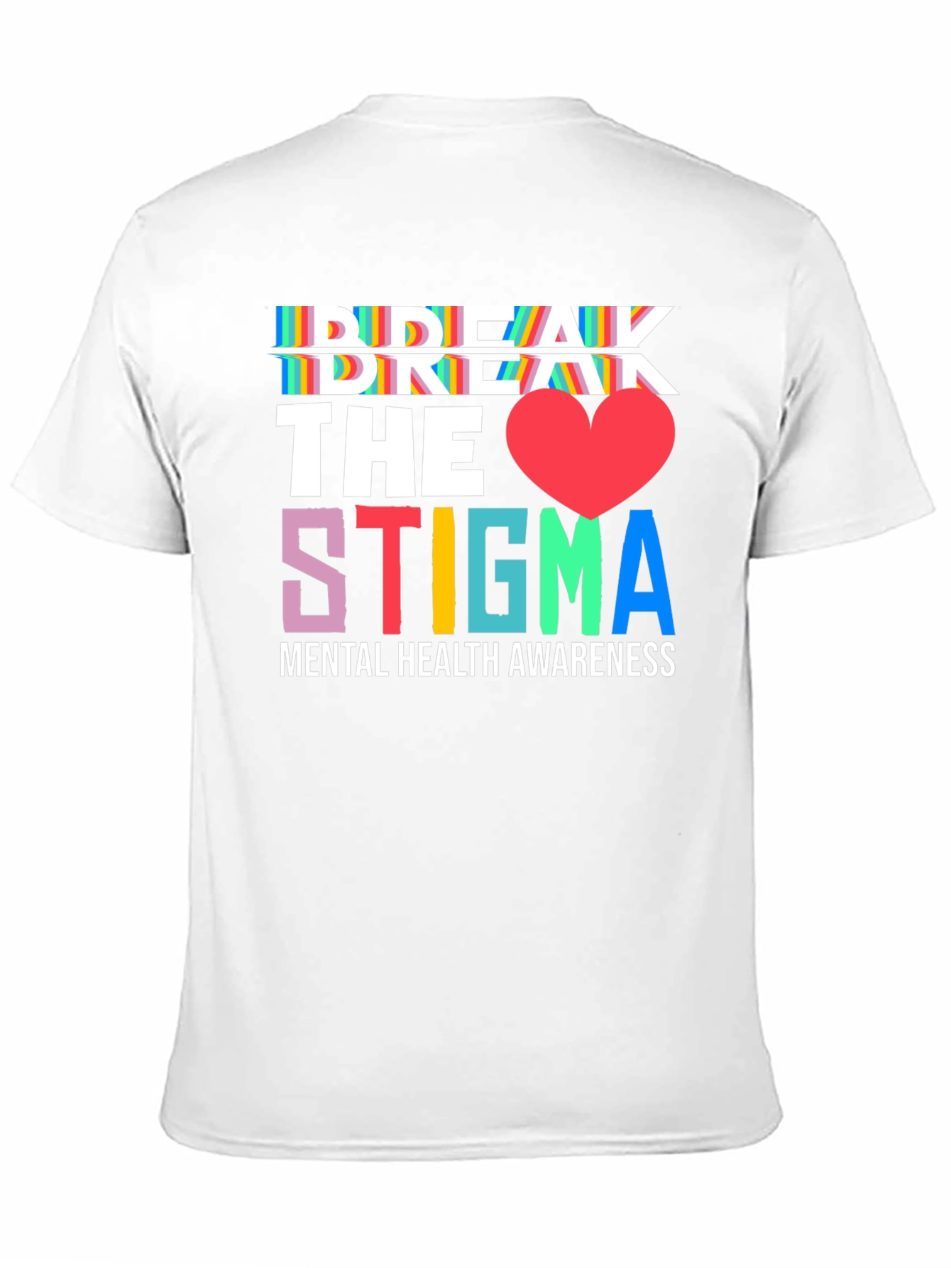 Show your support for mental health awareness with this striking t-shirt. The design features the powerful message "Break the Stigma" in a vibrant, multicolored font. The word "THE" is replaced by a red heart, adding a touch of hope and compassion. Below, "MENTAL HEALTH AWARENESS" is printed in a clean, readable font. The shirt is made of a soft-looking fabric and is a classic fit, perfect for everyday wear. Wear it to walks, events, or just around town to start conversations and raise awareness about mental health.