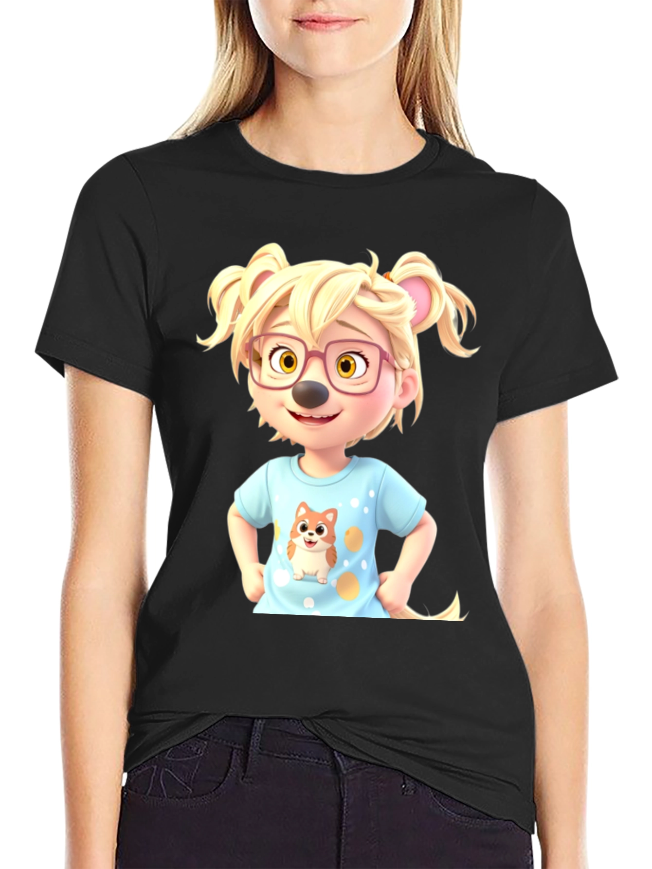 Elevate your casual style with this unique black T-shirt featuring a vibrant cartoon character design. The eye-catching graphic showcases a charming blonde character with glasses, wearing a light blue shirt adorned with a cute corgi dog print. This tee combines playful artistry with everyday comfort, perfect for expressing your fun-loving personality. Made from a soft and breathable fabric, this T-shirt ensures all-day comfort and a flattering fit. The bold black backdrop makes the colorful character truly pop, ensuring you stand out in any crowd. Ideal for casual outings, lounging at home, or making a statement, this T-shirt is a must-have addition to your wardrobe. Show off your unique style with this trendy and comfortable piece.