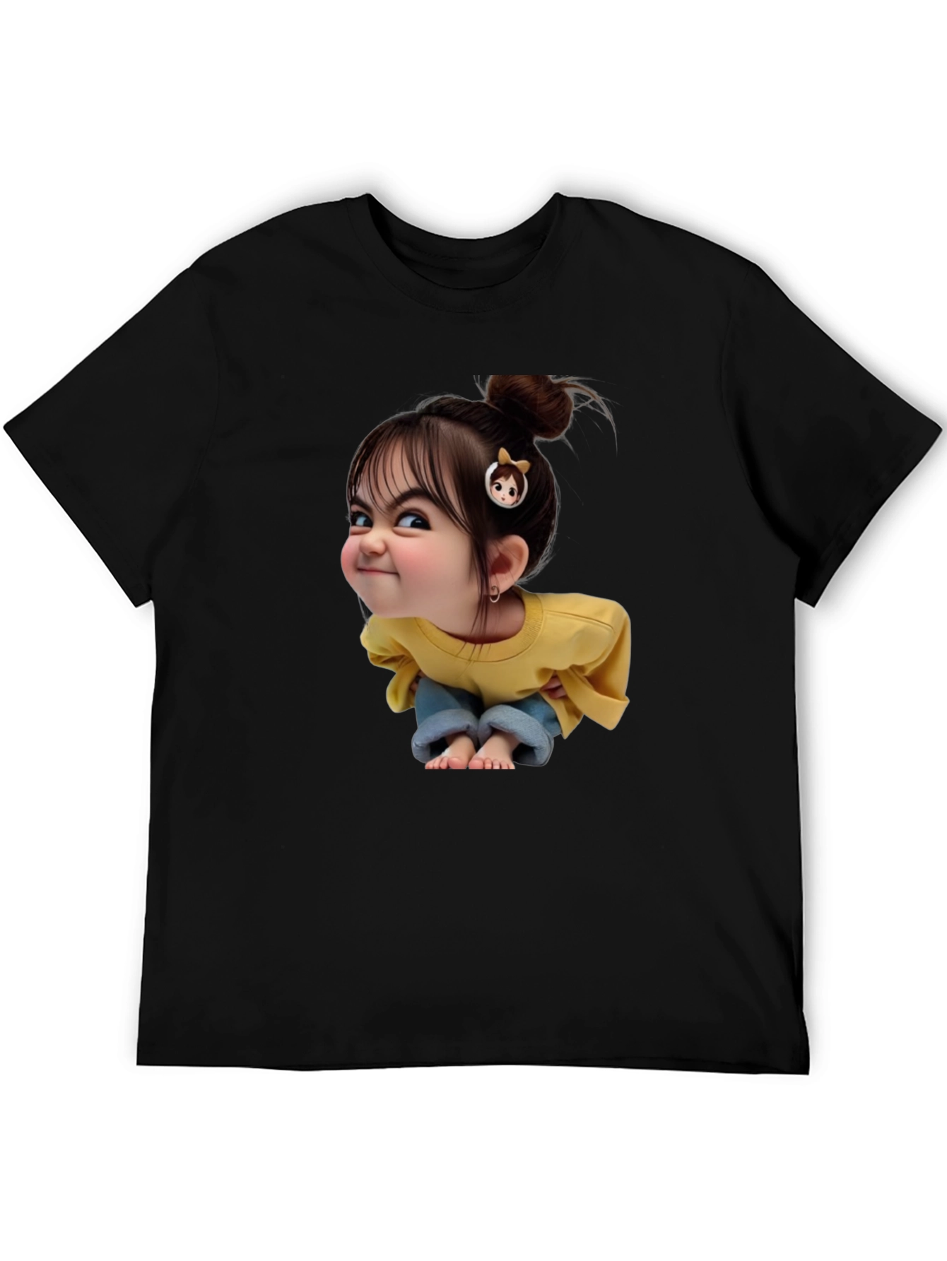This black t-shirt features a vibrant graphic of a playful cartoon girl. The print showcases a charming character in a yellow top and blue jeans, complete with cute details like a hair clip and mischievous expression. The t-shirt appears to be made from a soft, comfortable fabric, perfect for everyday wear. It would be a fun and stylish addition to any casual wardrobe, adding a touch of personality and charm. Ideal for those who love unique, eye-catching designs.