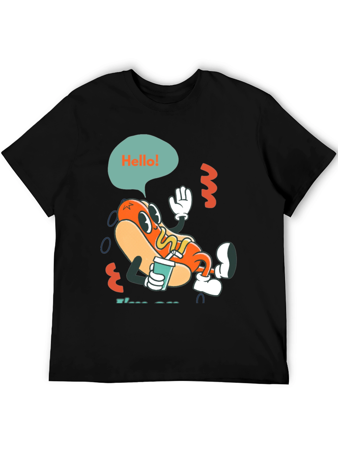 This black t-shirt features a playful cartoon graphic of a hotdog character. The hotdog is stylized with cartoon eyes, gloves, and shoes, giving it a fun, retro vibe. It's holding a drink and a speech bubble above reads "Hello!". The print also features abstract, squiggly decorations. Made from comfortable material, this t-shirt is perfect for casual wear. Show off your quirky side with this unique graphic tee. It's a great conversation starter and adds a touch of fun to your everyday wardrobe. Perfect for parties, weekend outings, or just lounging at home.