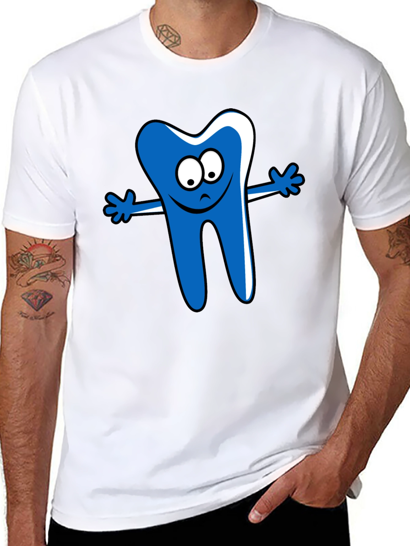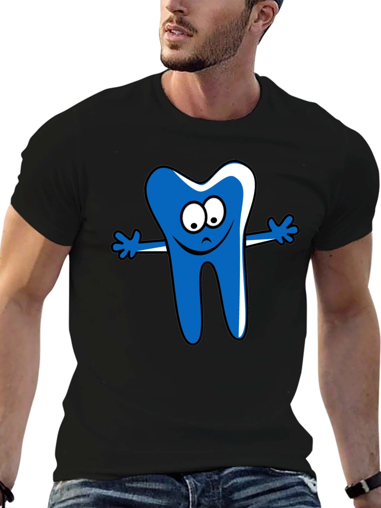 This black t-shirt features a playful cartoon tooth graphic on the front. The tooth is designed in a bright blue color with white accents. It has a cute, expressive face and outstretched arms, giving it a friendly and inviting appearance. The shirt itself appears to be made of a comfortable cotton material, perfect for everyday wear. This fun and unique t-shirt is ideal for dentists, dental hygienists, or anyone who loves a quirky and eye-catching design. Wear it to the office, dental conferences, or simply as a casual statement piece. It's sure to spark conversation and bring a smile to everyone's face! Get yours today and show off your dental pride!