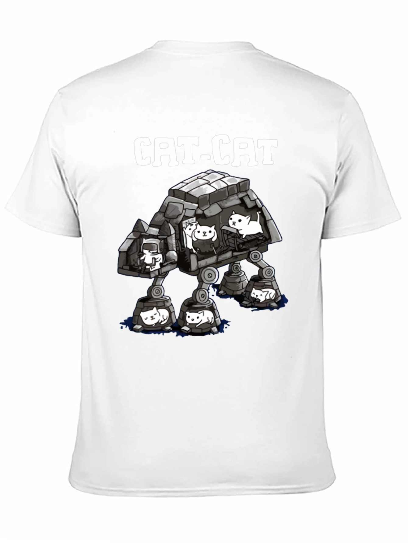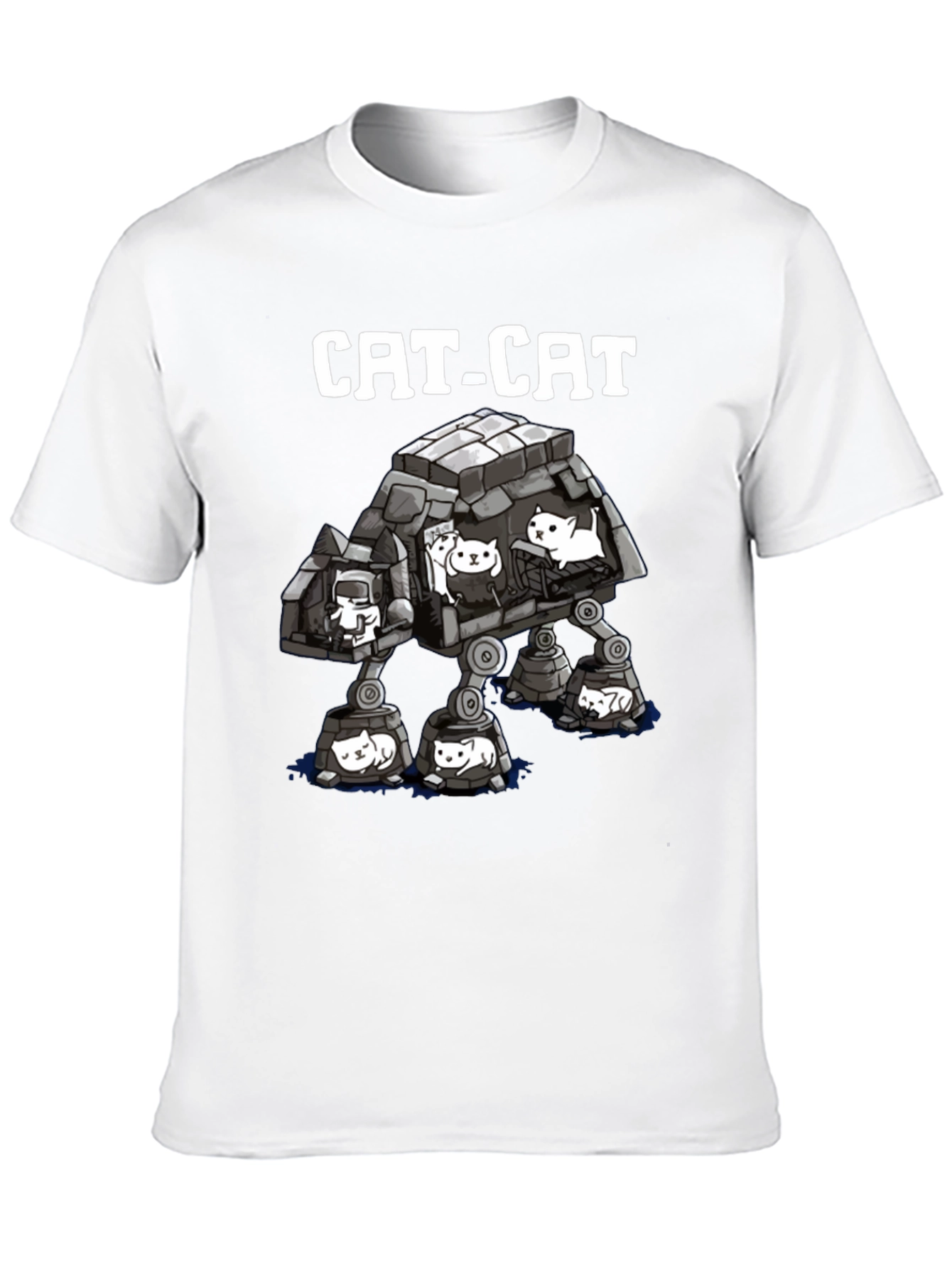 This black t-shirt features a unique graphic design of an AT-AT Walker parody with cats instead of soldiers. The text "CAT-CAT" is printed above the graphic, mimicking the original Star Wars vehicle's name. Made from comfortable-looking fabric, likely cotton or a cotton blend, this shirt is ideal for casual wear and expressing your love for both cats and the Star Wars franchise. It's a fun and eye-catching addition to any wardrobe, perfect for standing out from the crowd.