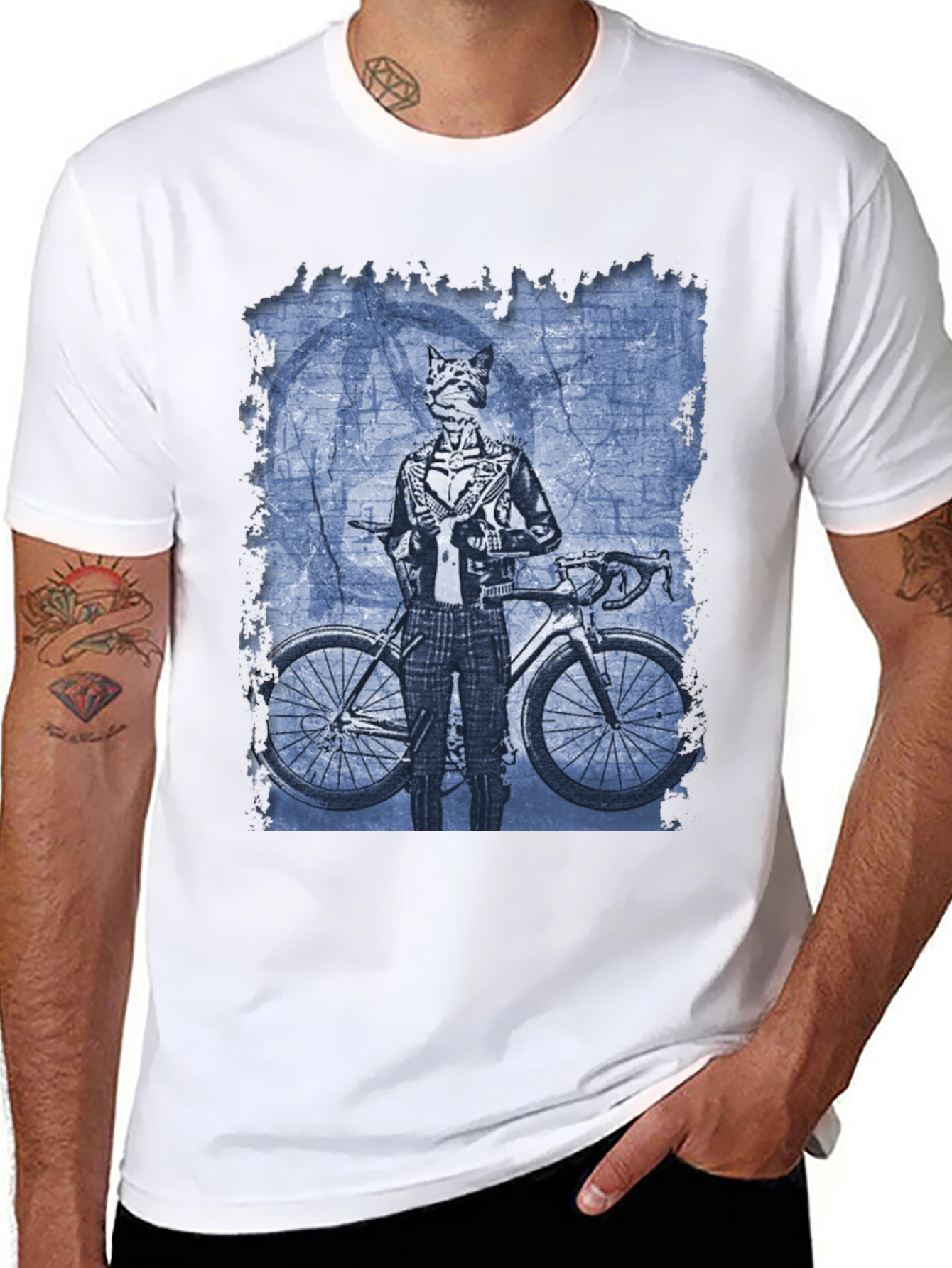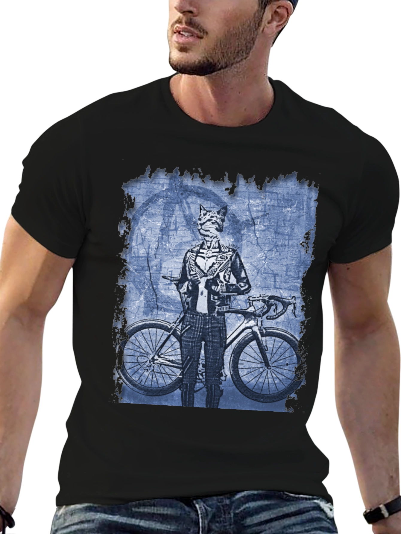 Show off your unique style with this eye-catching graphic tee! This black t-shirt features a distinctive design of a cat dressed in biker attire, complete with a leather jacket, standing alongside a bicycle. The intricate illustration is set against a faded blue backdrop, adding a vintage and edgy vibe. Made from comfortable, breathable fabric, this tee is perfect for everyday wear. Pair it with jeans or shorts for a casual yet cool look. Whether you're a cat lover, a biker enthusiast, or simply appreciate distinctive art, this t-shirt is a must-have addition to your wardrobe. Express yourself with this striking and unconventional piece!