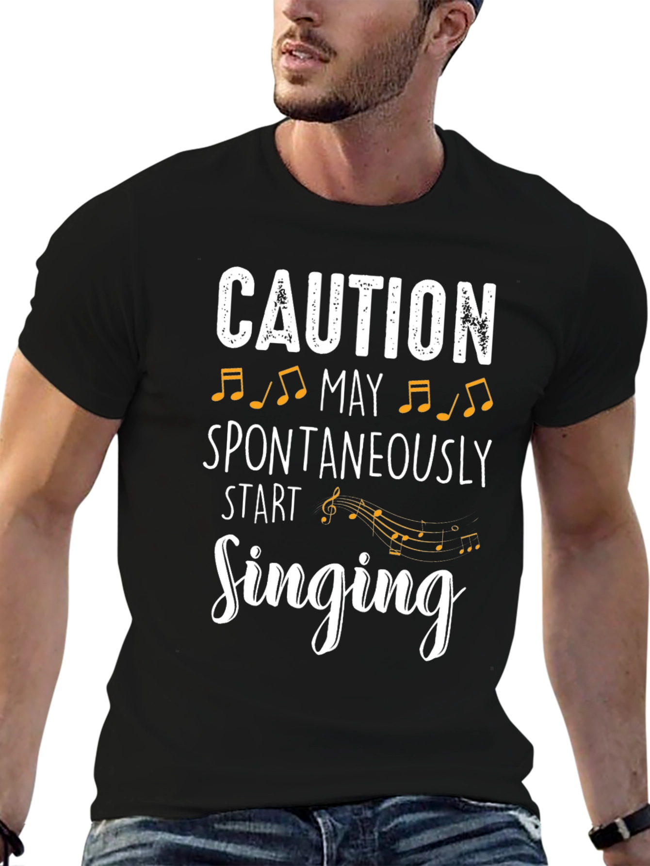 This stylish black t-shirt features a fun and playful design that's perfect for music lovers. The front of the shirt is printed with the phrase "Caution May Spontaneously Start Singing" in a combination of bold and script fonts, complemented by musical note graphics. Made from a soft and comfortable fabric, this tee is ideal for casual wear, concerts, or music-themed events. It's a great conversation starter and a fun way to express your love for music. Get ready to break out into song with this unique and eye-catching t-shirt!