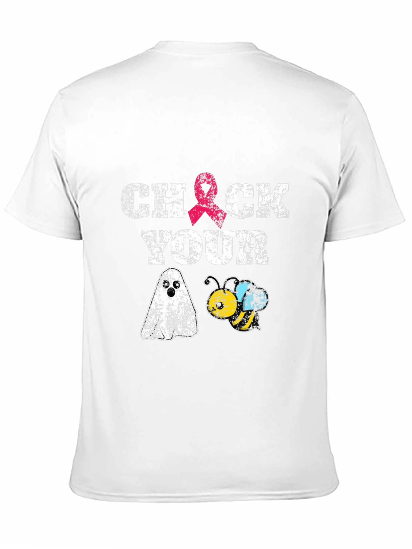 This eye-catching black t-shirt features a unique and playful design that promotes breast cancer awareness. The distressed white text "CHECK YOUR" is emblazoned across the chest, with a pink ribbon incorporated. Below the text are whimsical graphic illustrations of a ghost and a bee, rendered in a vintage, slightly distressed style. Made from a comfortable-looking fabric, this tee is ideal for casual wear, awareness walks, or as a conversation starter to spread an important message. It's a bold and fun way to support a vital cause.