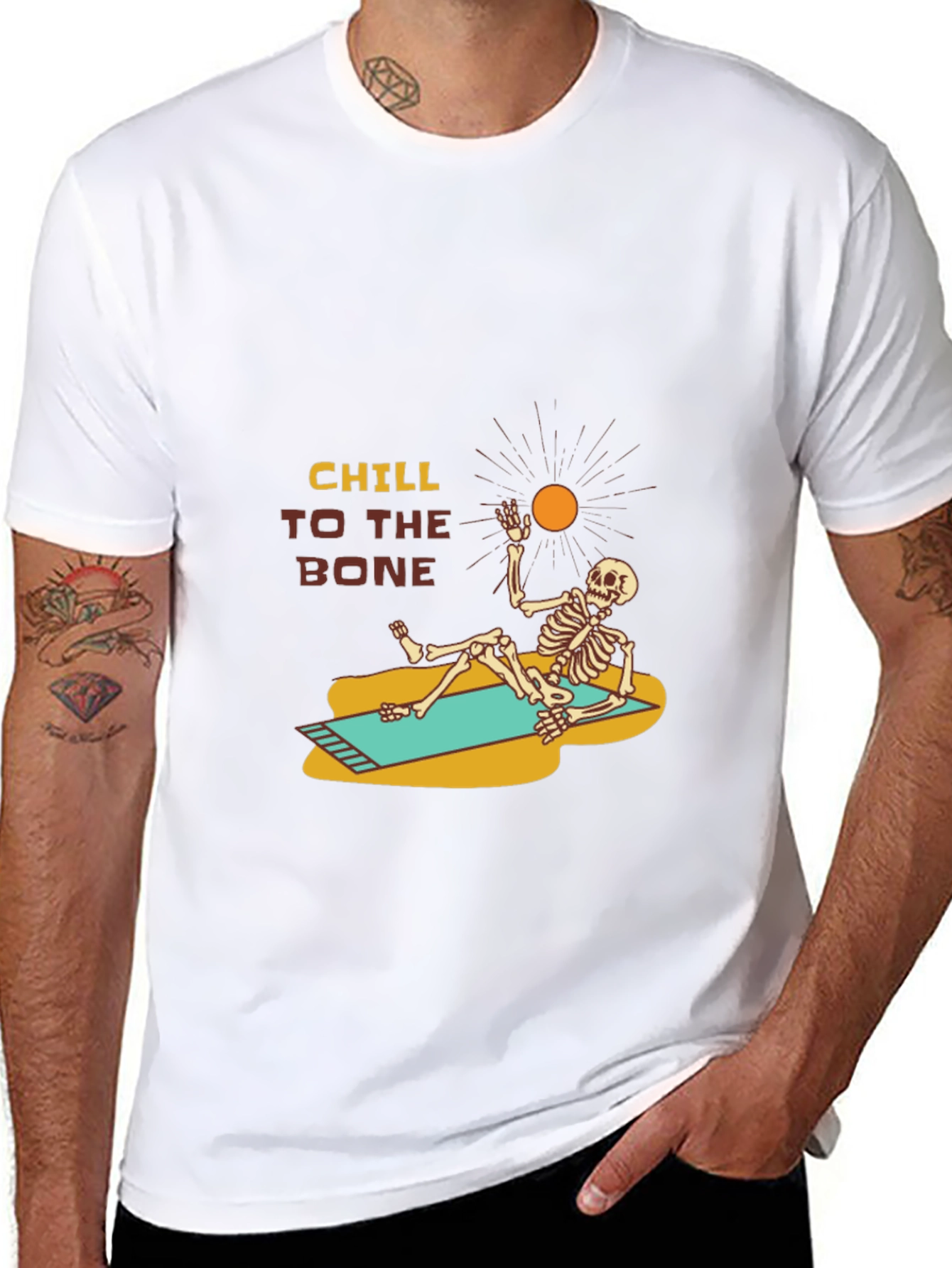 Embrace relaxation with this unique "Chill to the Bone" t-shirt. Featuring a vibrant graphic of a skeleton lounging on a beach mat, reaching for the sun, this tee adds a touch of humor to your casual wardrobe. The design is printed on a soft, comfortable black fabric, perfect for everyday wear. Show off your laid-back style with this eye-catching statement piece. Ideal for beach lovers, Halloween enthusiasts, or anyone who appreciates a fun, quirky design. Stay cool and comfortable while expressing your unique personality.