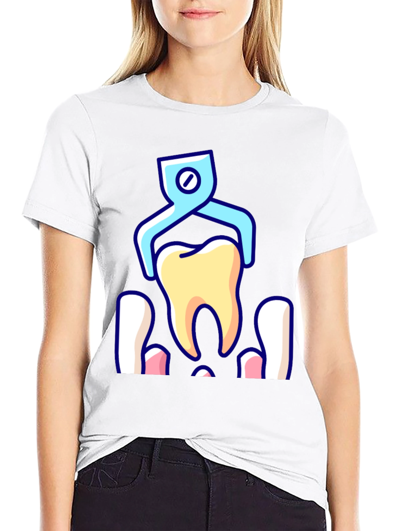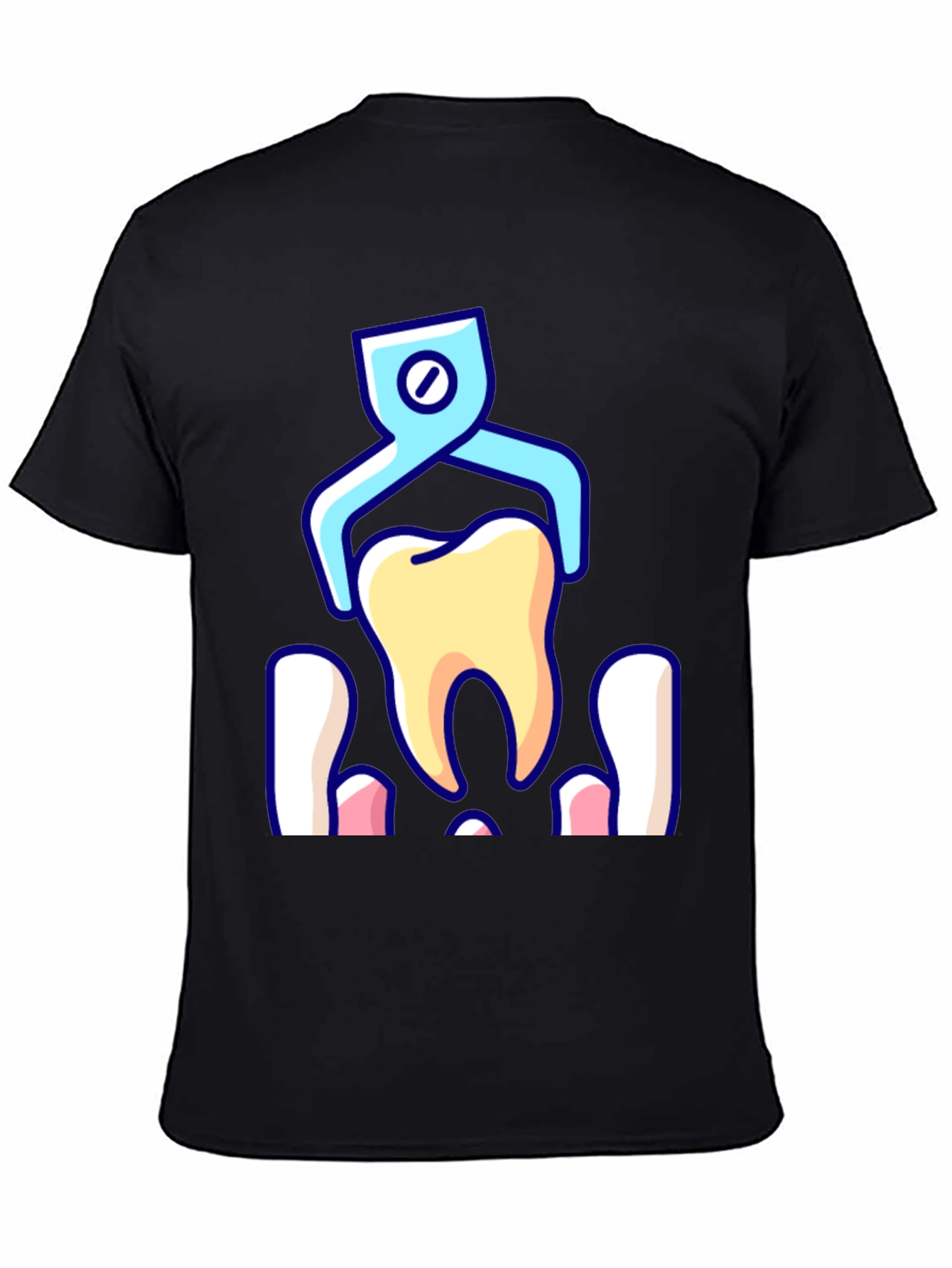 Show off your love for dentistry with this unique black t-shirt featuring a vibrant graphic design. The design depicts a tooth being extracted by dental tools, with a playful cartoon style. Made from a soft, comfortable fabric, this tee is perfect for casual wear, dental school students, or dental professionals. The eye-catching graphic makes it a great conversation starter and a fun way to express your interests. It's ideal for wearing to the office, school, or just out and about. This cool t-shirt also makes a thoughtful gift for your dentist, hygienist, or dental enthusiast friends.
