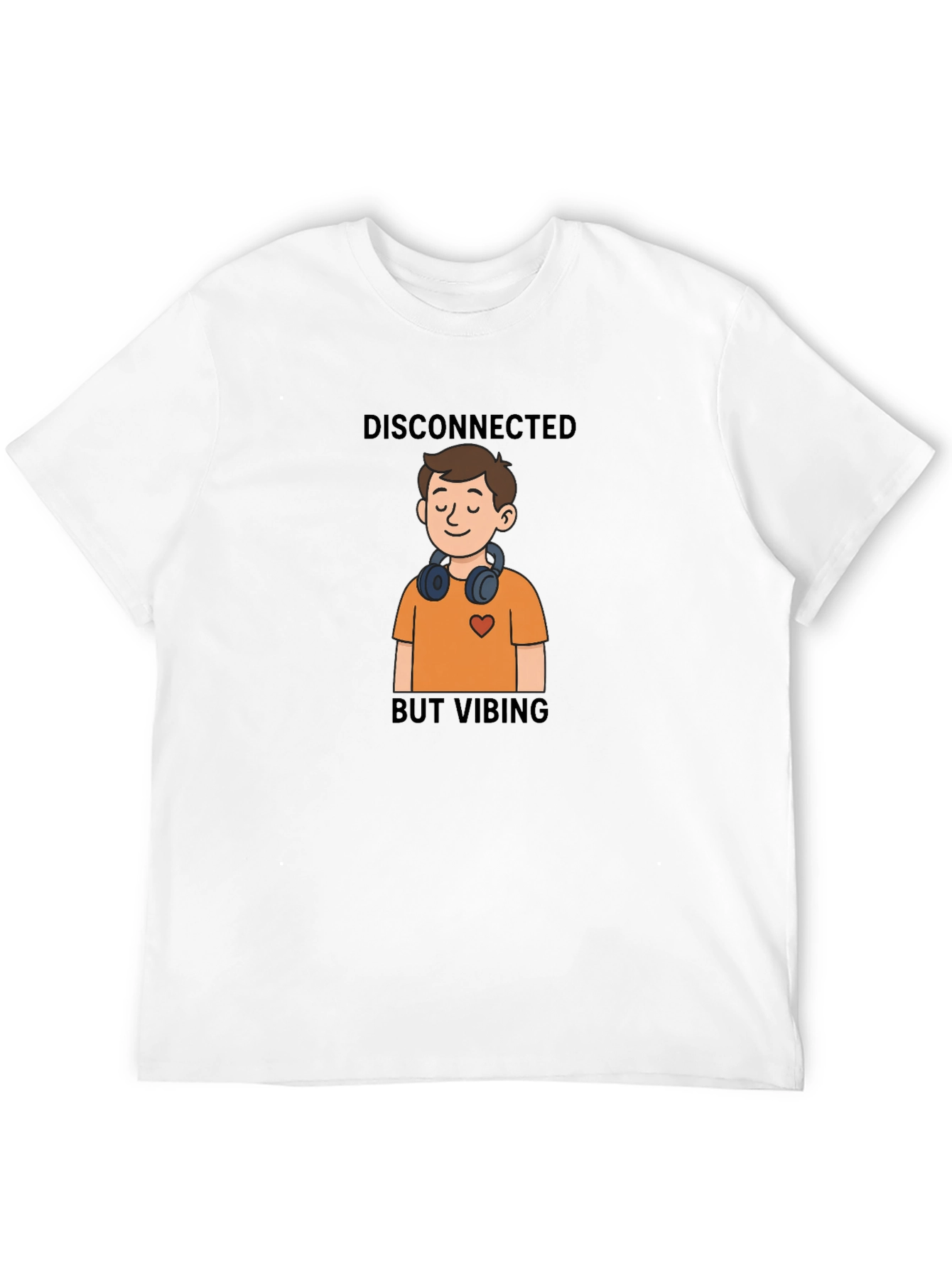 Showcase your unique style with this black t-shirt featuring a fun and relatable design. The shirt displays a cartoon graphic of a relaxed individual wearing headphones with the text "Disconnected But Vibing." It suggests a state of enjoying one's own company and peace. The t-shirt appears to be made of a soft, comfortable material and has a classic crew neck and short sleeves, making it perfect for everyday wear. Whether you're lounging at home, running errands, or meeting friends, this shirt will keep you comfortable and stylish.