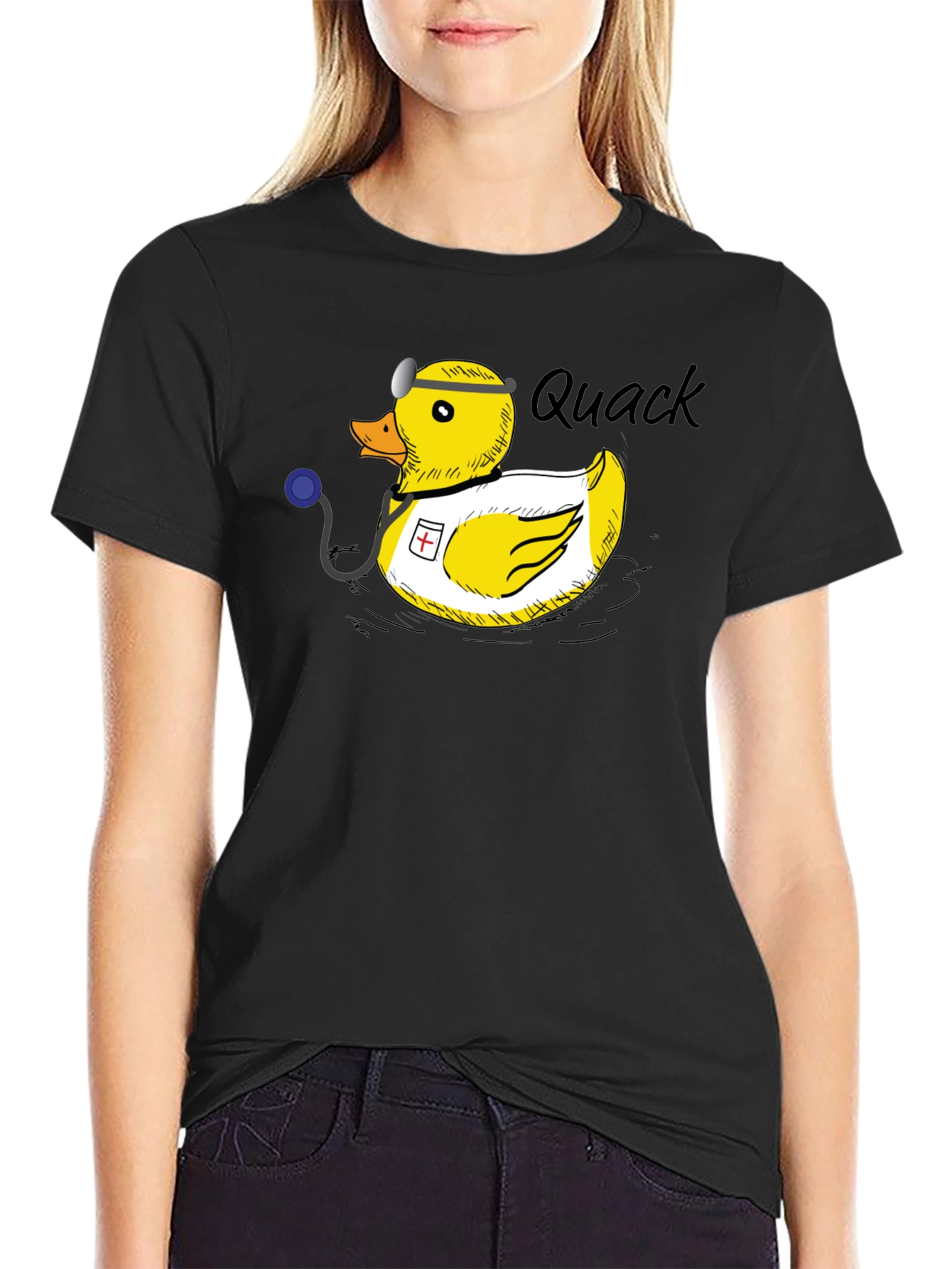 This t-shirt features a playful and humorous design of a cartoon yellow rubber duck dressed as a doctor. The duck is shown wearing a stethoscope and a head mirror, adding to the medical theme. A graphic of a square with a medical plus sign is featured on the duck. Above the duck, the word "Quack" is printed in a script-style font, referencing the duck's sound and adding to the lightheartedness of the design. The black fabric of the shirt provides a contrasting backdrop that makes the vibrant yellow duck stand out. This t-shirt would be great for casual wear.