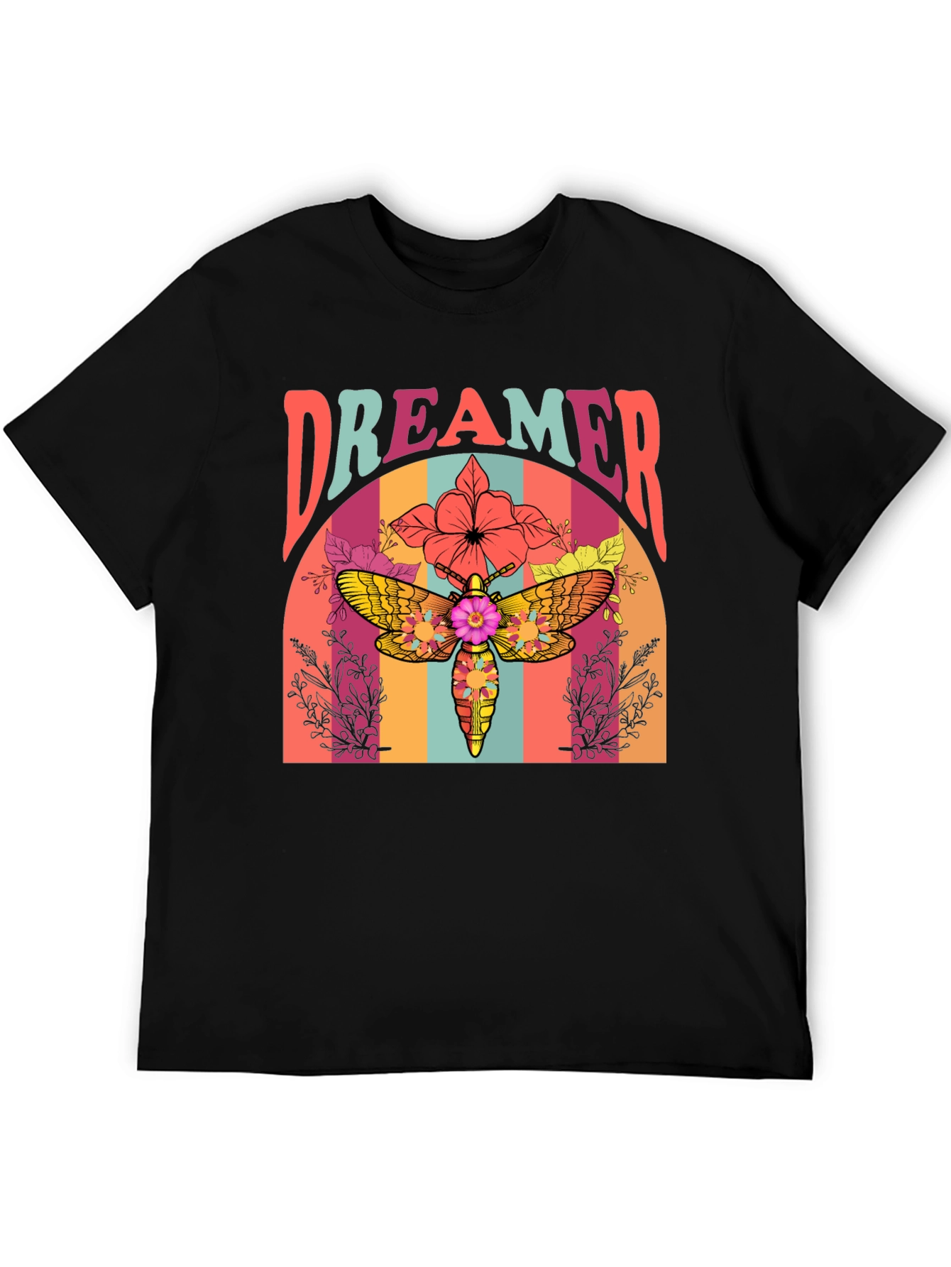 Embrace your inner dreamer with this eye-catching graphic t-shirt. This unique design features a vibrant moth illustration adorned with floral accents, set against a retro-inspired rainbow backdrop. The word "DREAMER" is boldly displayed in a playful, vintage-style font. Crafted from a comfortable, breathable fabric, this t-shirt is perfect for everyday wear. The classic black color makes it a versatile addition to any wardrobe, while the intricate graphic adds a touch of whimsy and personality. Ideal for casual outings, music festivals, or simply expressing your creative spirit. Let your imagination take flight with this stylish and inspiring tee!