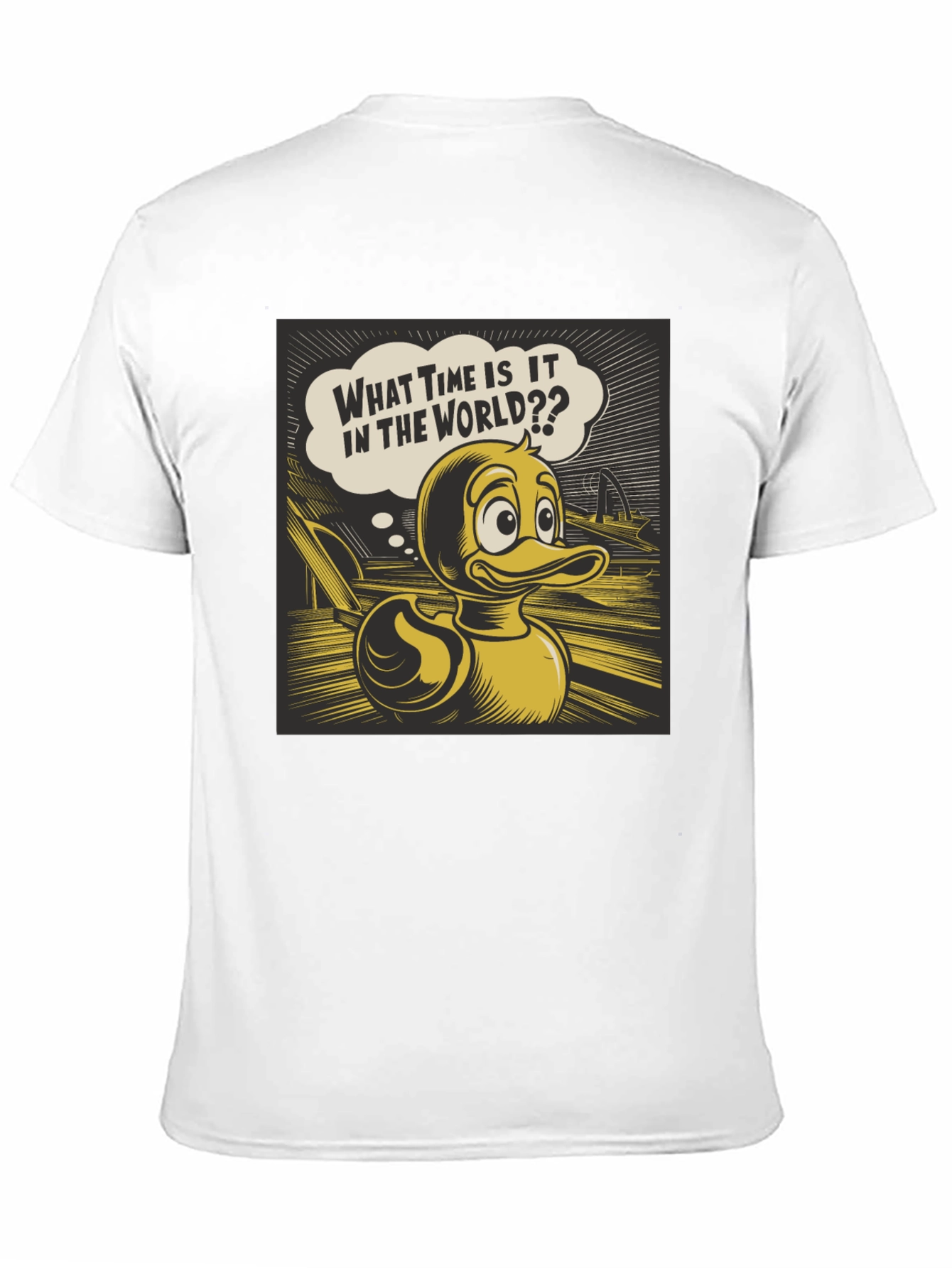 Make a statement with this eye-catching black t-shirt. The design features a unique cartoon duck graphic, complete with a speech bubble that adds a playful touch. This tee is perfect for casual outings, adding a bit of fun to your everyday wardrobe. The graphic style has strong outlines with yellow and black. Made with comfortable materials, it ensures a great fit and lasting wear. Stand out from the crowd with this unique piece!