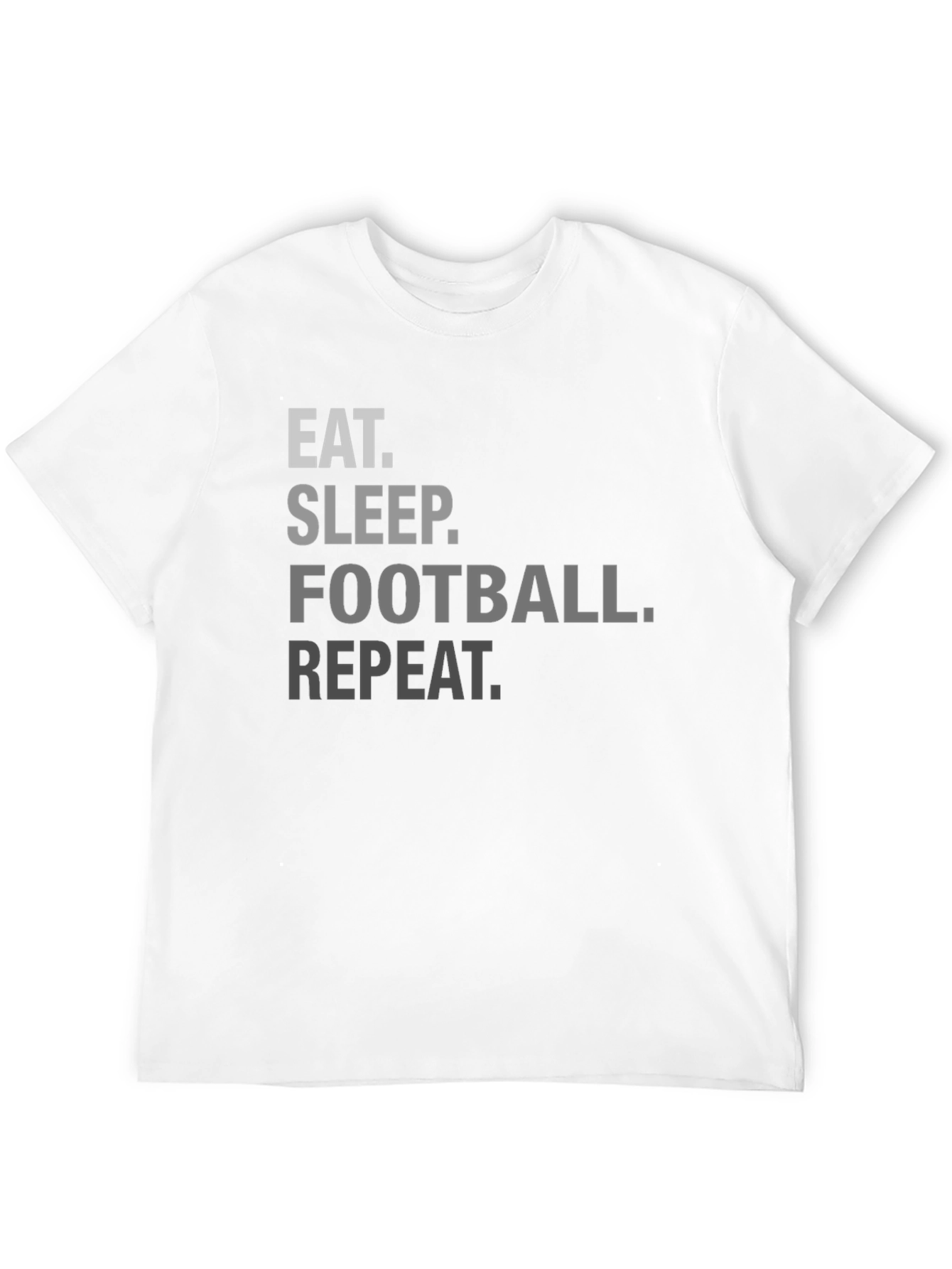 Show your passion for football with this stylish and comfortable t-shirt. The shirt features the phrase "EAT. SLEEP. FOOTBALL. REPEAT." in a crisp, modern font. The graphic is bold and eye-catching. Made from what appears to be a soft, breathable material, this tee is perfect for game days, practice, or casual wear. The classic fit makes it suitable for a wide range of body types. Get yours today and let everyone know what you love!