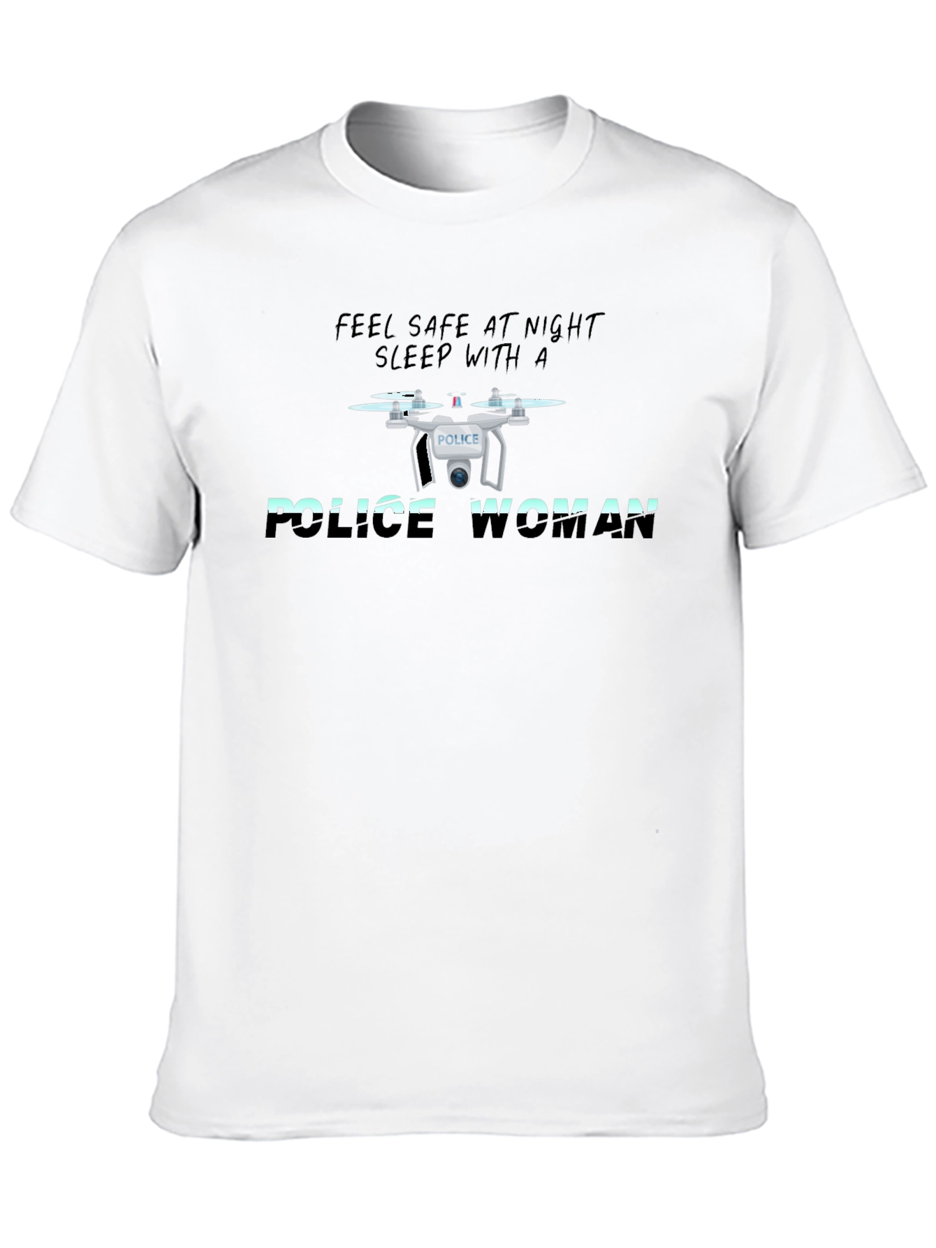 This black t-shirt features a humorous design with a police drone image. Above the drone, the text reads "Feel safe at night sleep with a." Below, the words "Police Woman" are printed with a bright, digital effect. The shirt is made from a soft-looking fabric, promising comfort and durability. It's a fun, quirky item, perfect for casual wear or as a gag gift for law enforcement supporters with a sense of humor. Its dark color makes it versatile for pairing with jeans or shorts, making it a standout piece in any wardrobe.