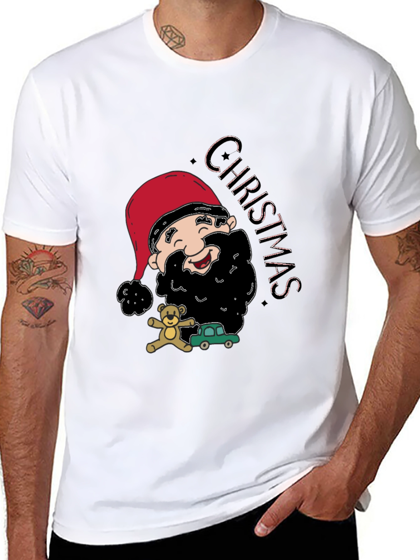 Spread holiday cheer with this fun black t-shirt featuring a cartoon Santa Claus design! The whimsical graphic includes Santa with a red hat, a cheerful smile, and a fluffy black beard, accompanied by a teddy bear and a green toy car. The word "CHRISTMAS" is vertically displayed beside him. Made from comfortable fabric, this tee is perfect for casual wear during the holiday season. It's a great way to show off your festive spirit. Get yours today and celebrate in style!