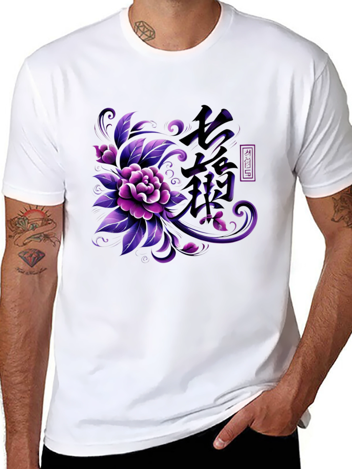 This stylish black t-shirt features a vibrant floral design with Japanese Kanji characters. The intricate artwork showcases purple and black hues, creating a visually striking contrast against the dark fabric. Made from a soft, comfortable material, this tee offers both style and wearability. Perfect for casual outings, streetwear fashion, or expressing your appreciation for Japanese culture. The unique design is sure to turn heads and spark conversations. Add this eye-catching piece to your wardrobe and make a statement wherever you go. It is a great gift for friends and family too.