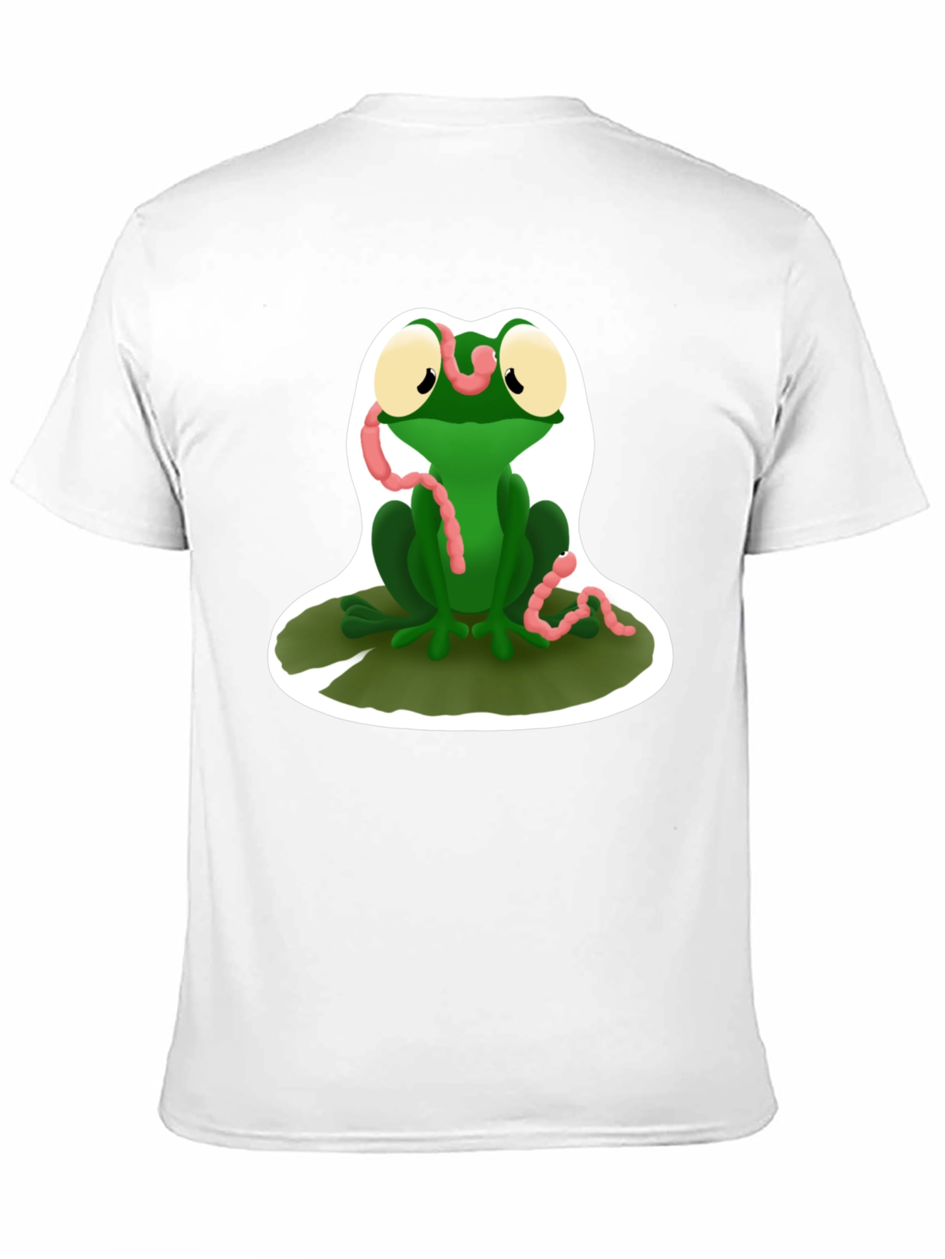 Add a whimsical touch to your wardrobe with this fun graphic t-shirt! The design features a cartoon-style green frog sitting on a lily pad, playfully attempting to eat a pink worm. The print has a white backdrop, ensuring that the colors pop against the black fabric of the shirt. Perfect for casual wear, this t-shirt is sure to be a conversation starter. Made from a soft, comfortable material, it's ideal for everyday use. Show off your unique sense of style with this eye-catching tee!