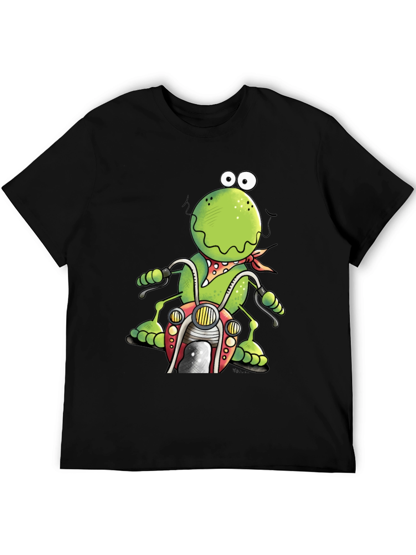 Show off your quirky side with this eye-catching black t-shirt featuring a cartoon frog riding a motorcycle. The humorous design is printed on a comfortable, breathable fabric, perfect for everyday wear. The vibrant colors of the motorcycle and the frog's bandana pop against the black background, making it a standout piece. Ideal for casual outings, motorcycle enthusiasts, or anyone who loves fun, unique apparel. Add a touch of whimsy to your wardrobe with this playful and comfortable t-shirt!