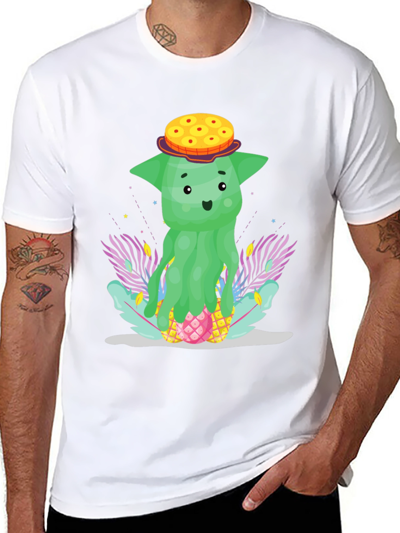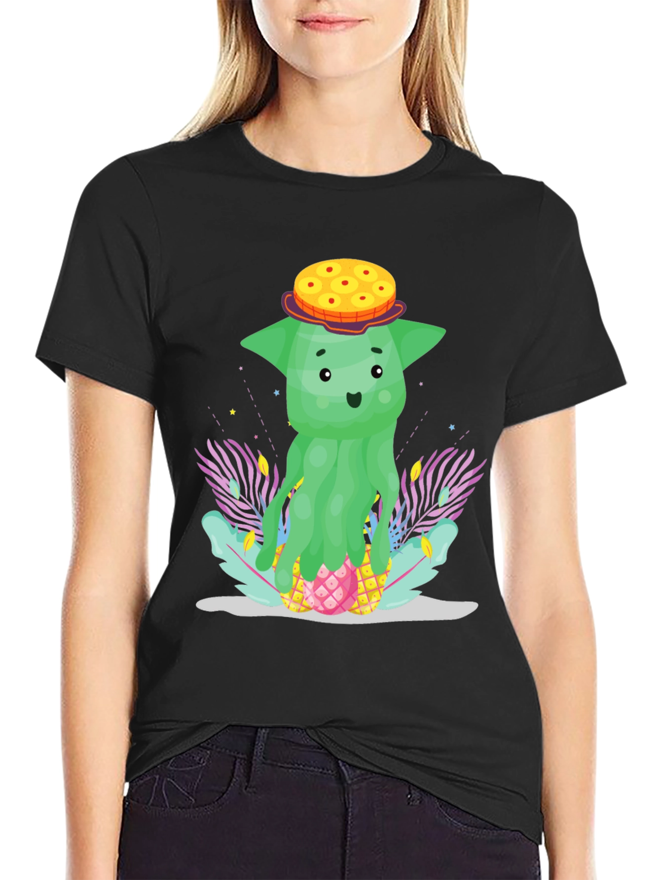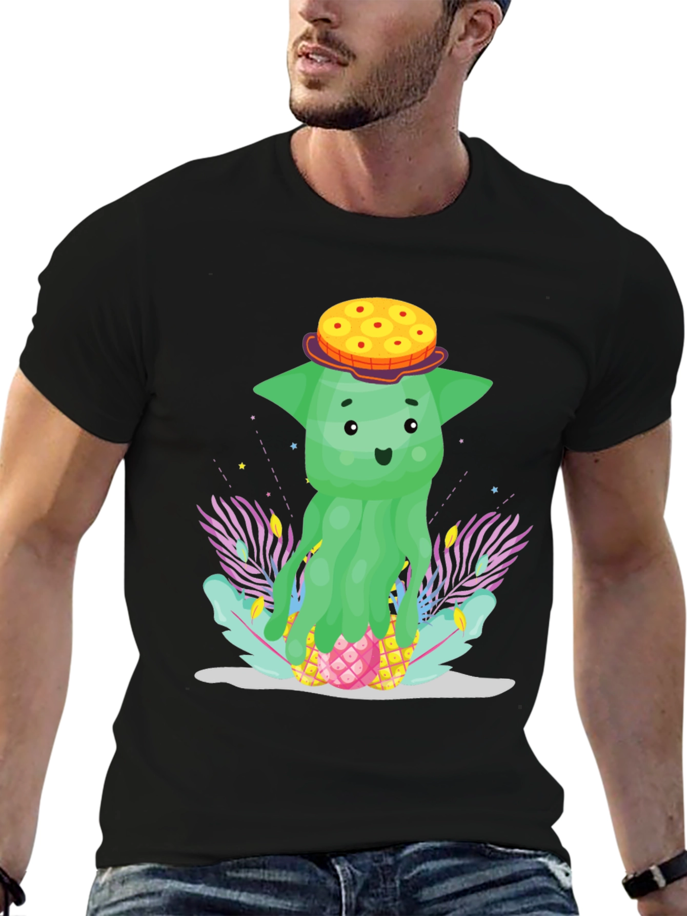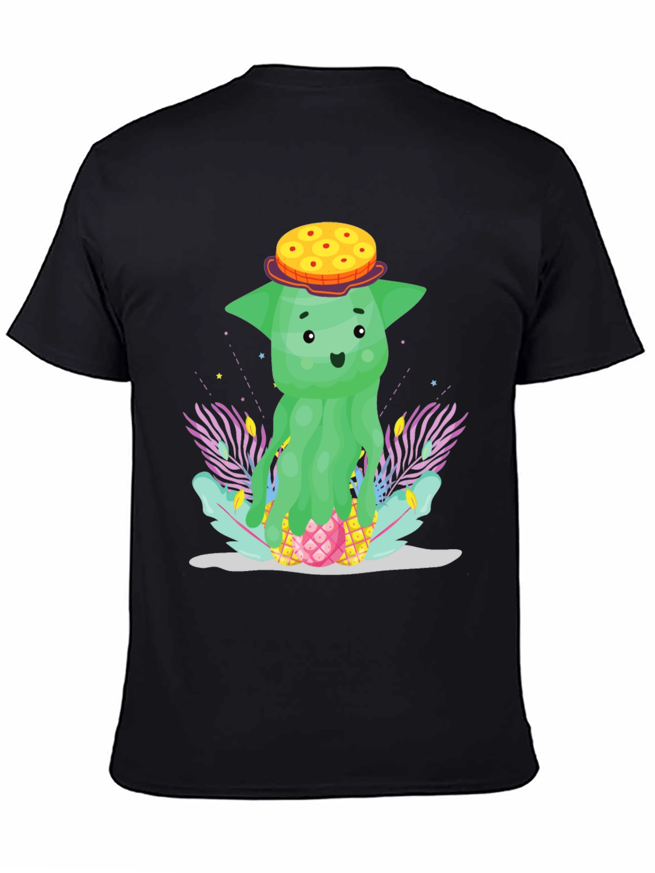 Show off your quirky side with this unique black t-shirt featuring a cartoon pineapple character. This fun design showcases a green, slightly alien-like pineapple figure sporting a donut hat, nestled amongst stylized tropical foliage. The playful design and vibrant colors make this tee a standout piece for casual wear. Perfect for adding a touch of humor and personality to your everyday style. This t-shirt is sure to be a conversation starter, suitable for summer outings, vacations, or simply expressing your love for the tropics and fun cartoons. Comfortable and eye-catching, this shirt is a must-have for anyone who loves unique and cheerful designs.