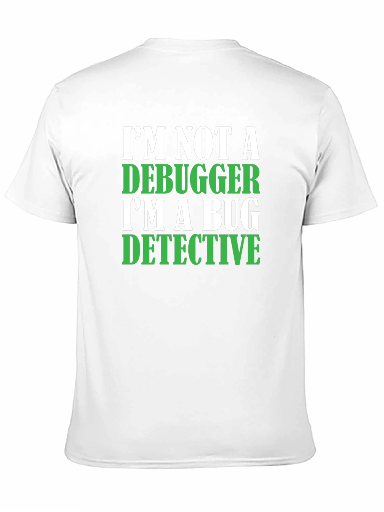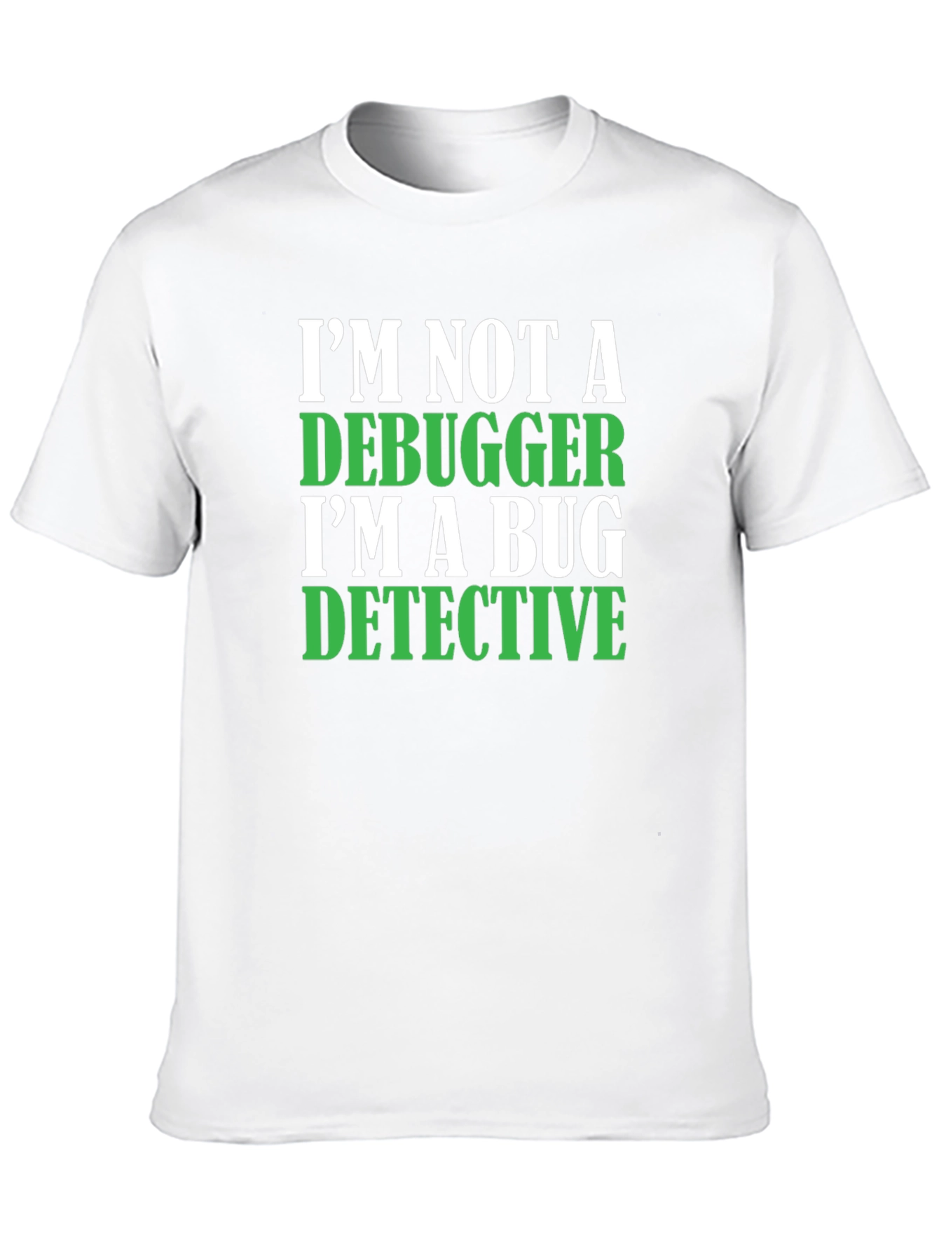 This black t-shirt features a humorous slogan. In bold, easy-to-read letters it says, "I'M NOT A DEBUGGER I'M A BUG DETECTIVE." The words "DEBUGGER" and "BUG" are colored green, offering a subtle contrast to the white and black. Ideal for casual wear, this shirt is perfect for programmers, software engineers, or anyone with a good sense of humor. Show off your tech wit with this unique and eye-catching design. It's made of comfortable material for all-day wear.