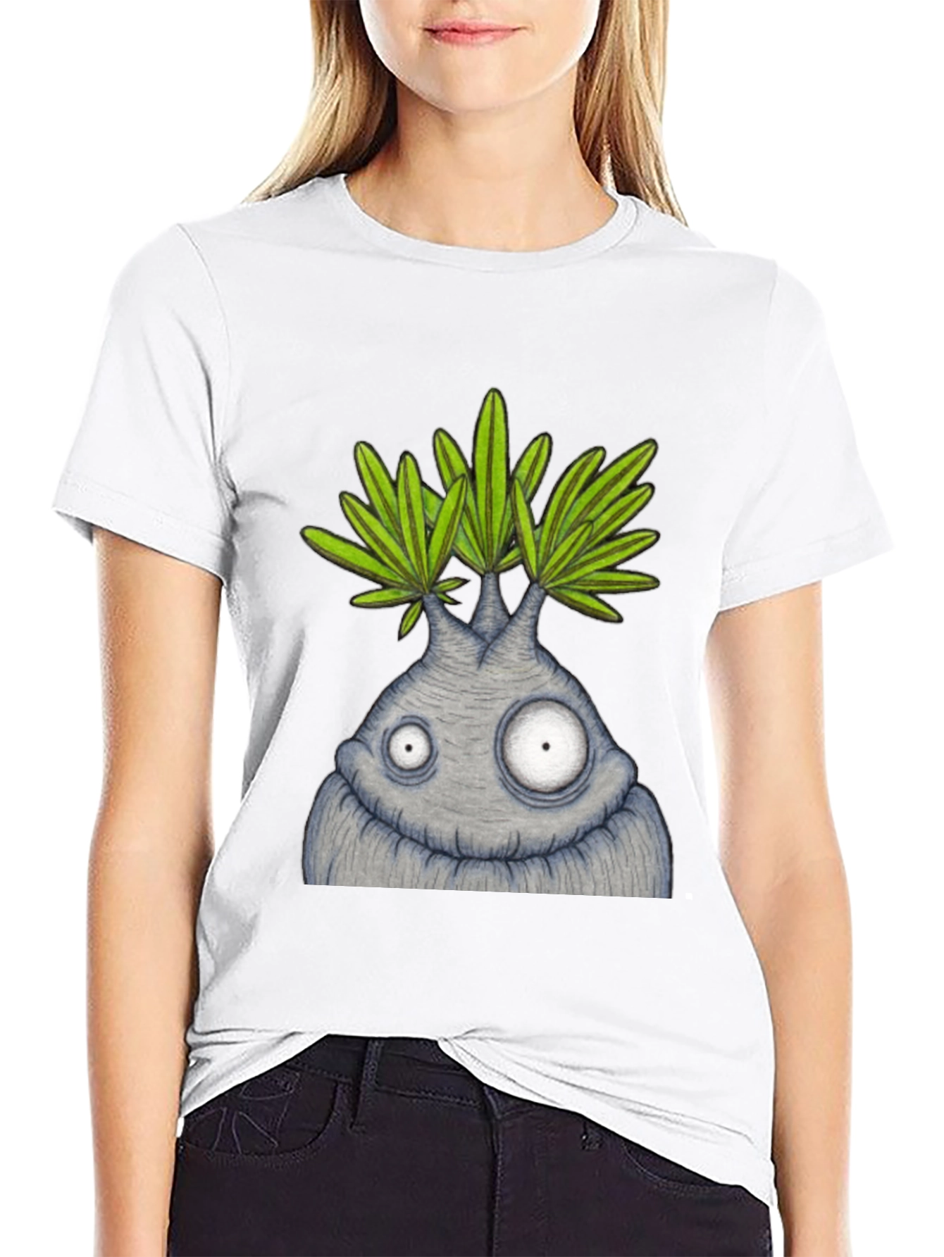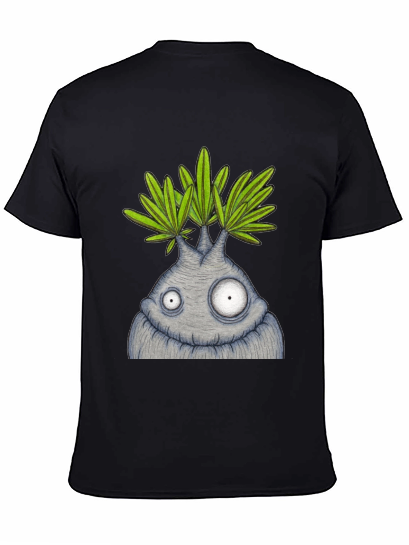 Show off your unique style with this eye-catching black t-shirt. The shirt features a humorous graphic print of a bulbous plant character with quirky, mismatched eyes and green foliage sprouting from its head. Made from a comfortable-looking, breathable fabric, this tee is perfect for casual wear. Its playful design adds a fun twist to any outfit, making it a great conversation starter. Ideal for those who appreciate quirky art, plants, or simply want to inject some humor into their wardrobe. This t-shirt offers a relaxed fit and can be easily paired with jeans, shorts, or layered under a jacket.