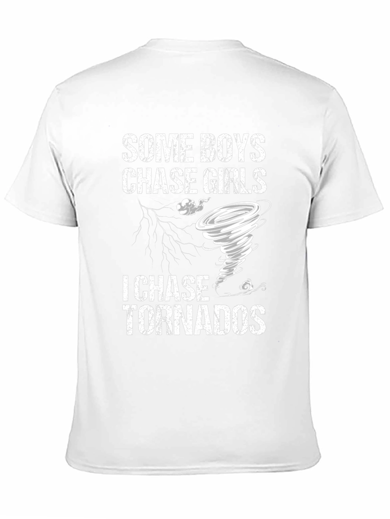 Show off your unique hobby with this eye-catching t-shirt. This black tee features a bold white graphic with the humorous phrase "Some boys chase girls I chase tornados," accompanied by a detailed illustration of a swirling tornado and lightning. Made from a soft, comfortable fabric, this shirt is perfect for casual wear, whether you're out exploring or relaxing at home. A great conversation starter and a fun way to express your love for extreme weather. Durable and stylish, this tee makes a perfect gift for weather enthusiasts and storm chasers. Get yours today and wear your passion with pride!
