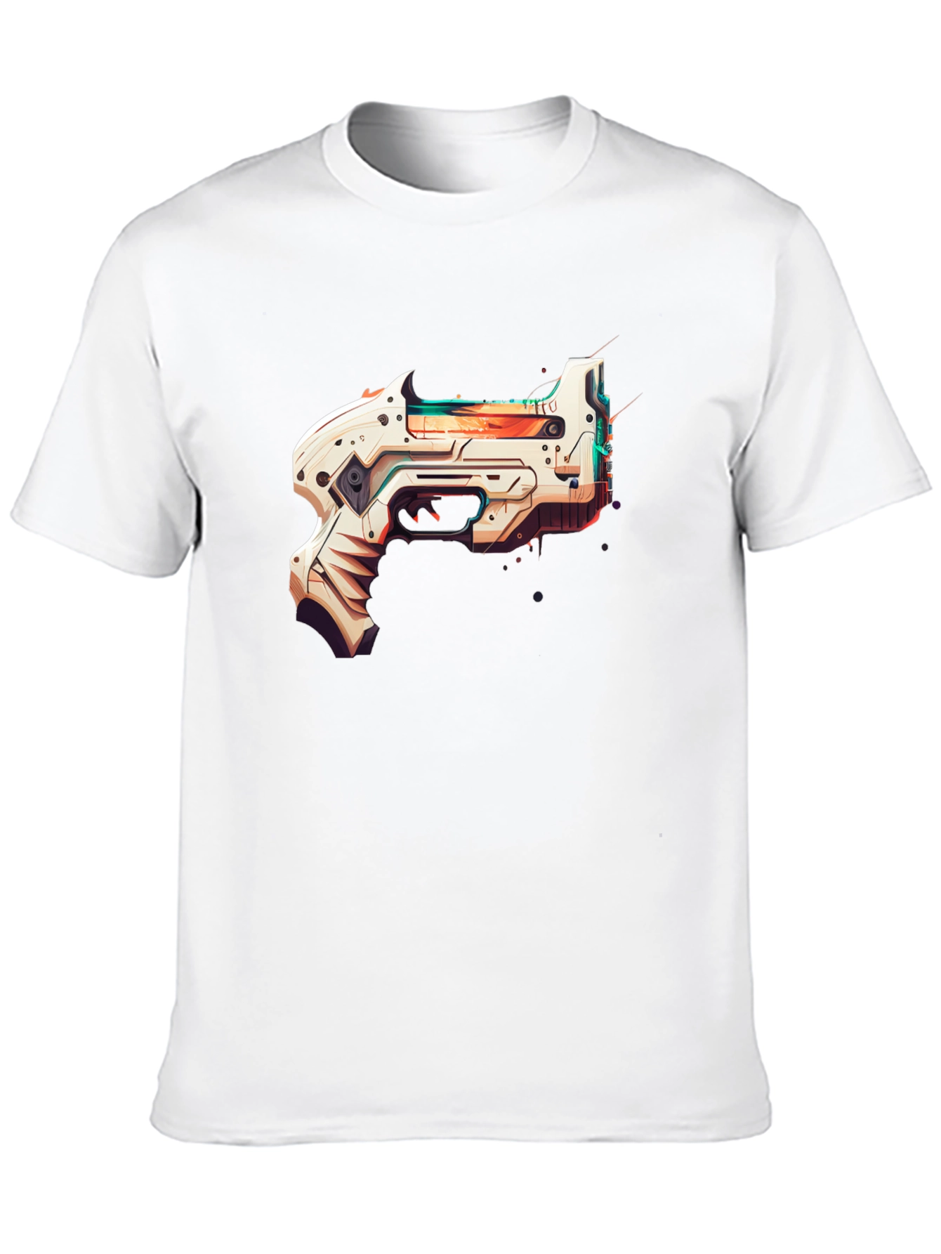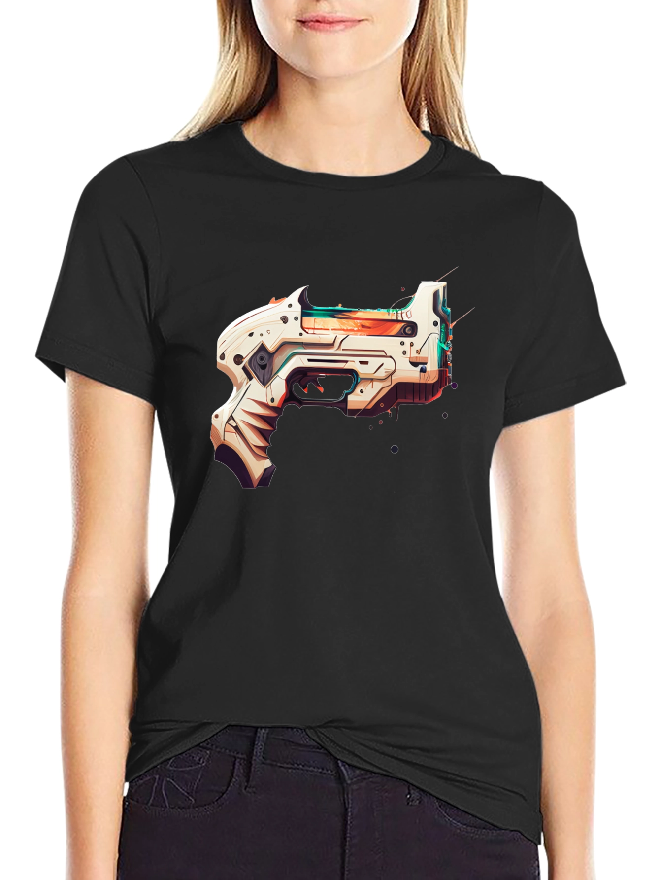Step into the future with this stylish black t-shirt featuring a bold, futuristic gun graphic. The design is a captivating blend of sharp, geometric lines and vibrant colors, giving it a modern, eye-catching aesthetic. The graphic is prominently displayed on the front of the shirt, making it a great conversation starter. Crafted from a soft, breathable fabric, this tee ensures maximum comfort while making a statement. Perfect for casual outings, gaming events, or simply expressing your unique style. Add a touch of sci-fi flair to your wardrobe!