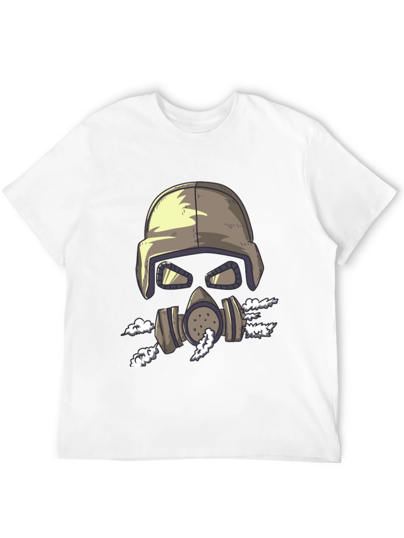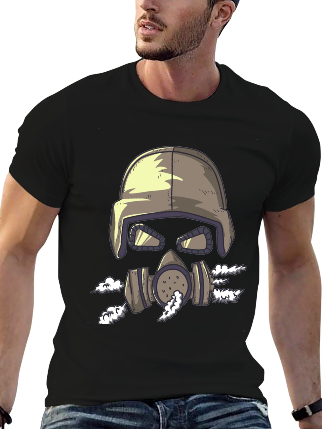 This black t-shirt features a unique graphic of a skull wearing a military helmet and gas mask, with smoke billowing around it. The design is eye-catching and edgy, perfect for those who want to stand out. Made from a soft, comfortable fabric, this tee is ideal for everyday wear. Its short sleeves and classic fit make it a versatile addition to any wardrobe. Show off your unique style with this bold graphic tee, perfect for casual outings, concerts, or just lounging around.