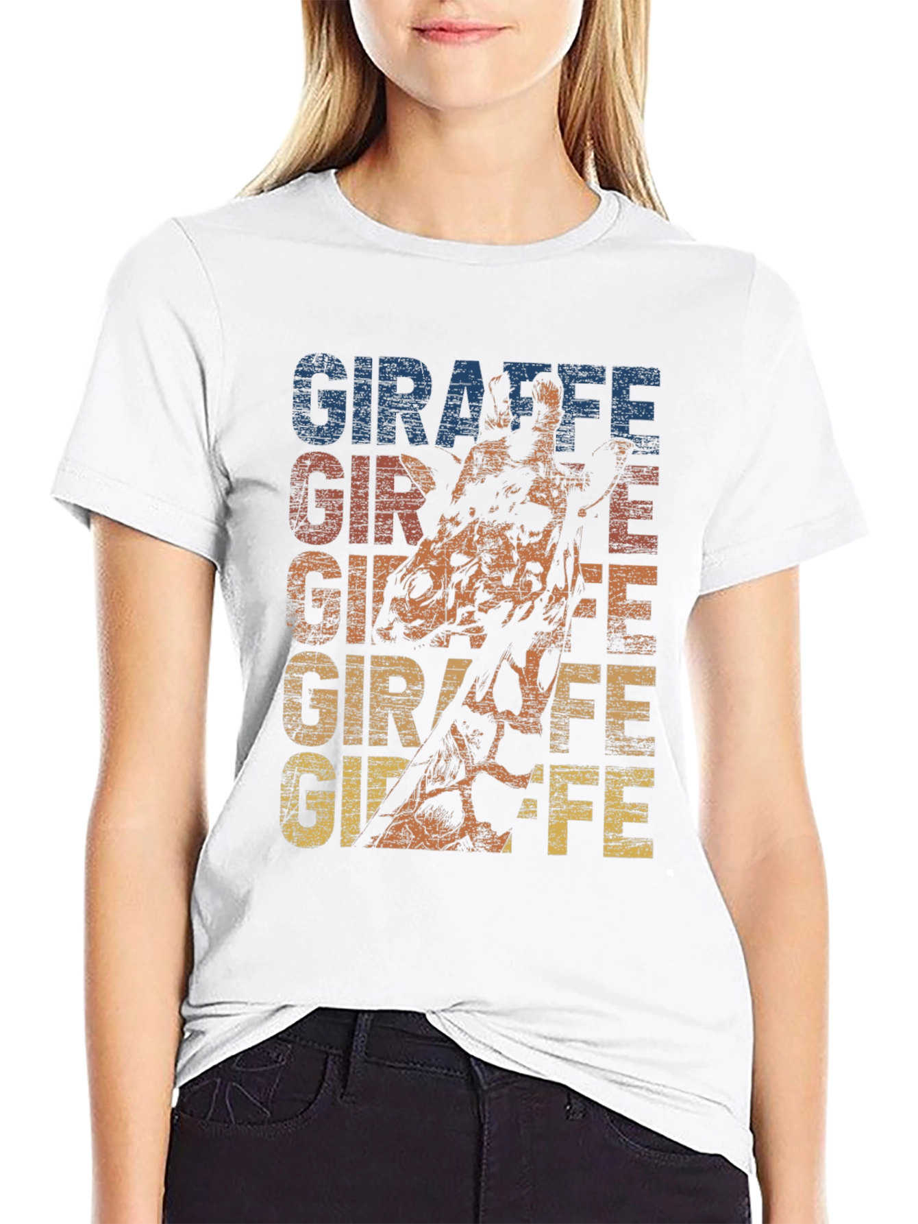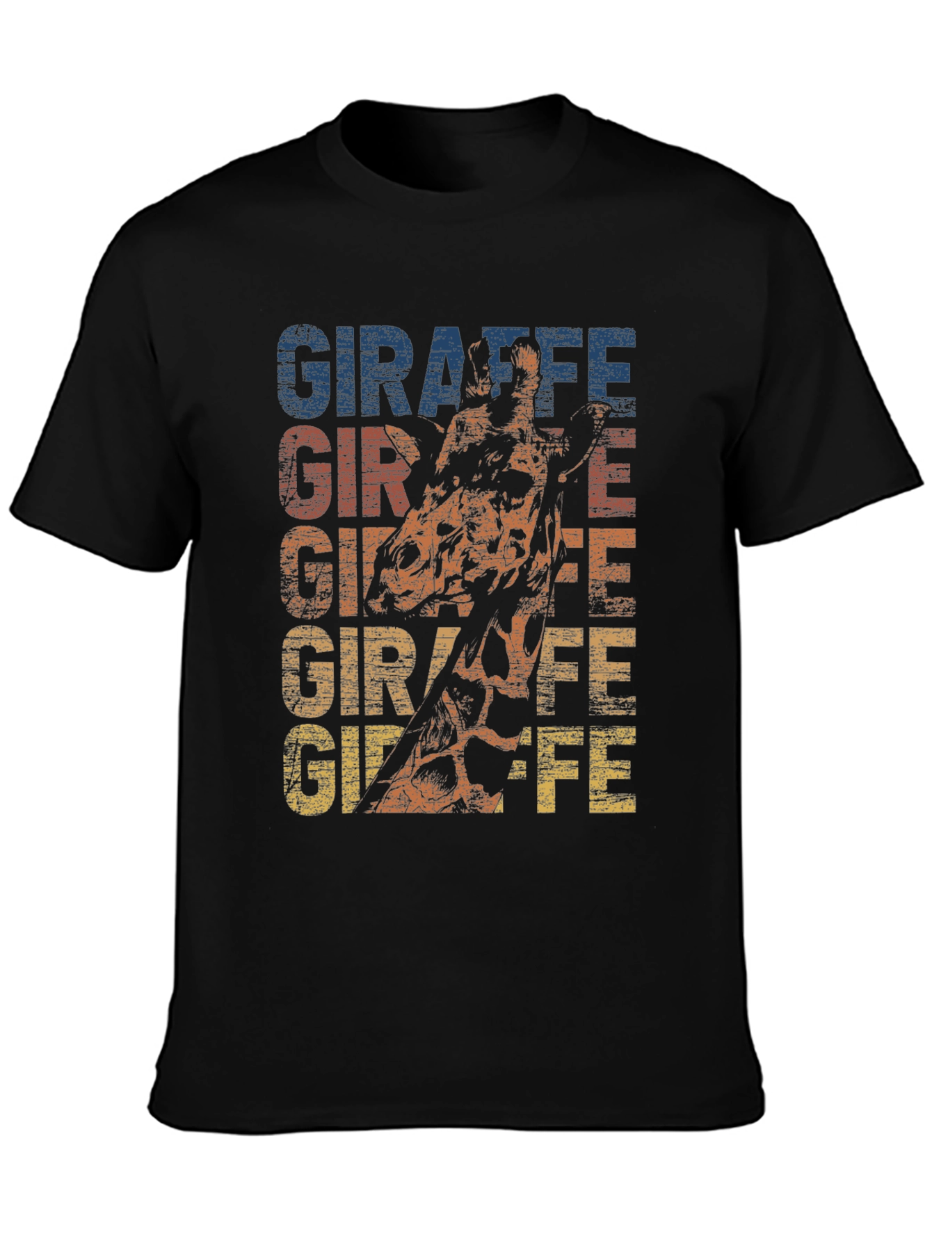 Showcase your wild side with this stylish black t-shirt. Featuring a vibrant giraffe print with the word "GIRAFFE" stacked in eye-catching, slightly distressed colors, this tee is a unique statement piece. Crafted from a soft, comfortable fabric, it offers a classic crew neck and short sleeves for a relaxed fit. Perfect for casual outings, animal lovers, or anyone looking to add a touch of personality to their wardrobe. Pair it with jeans or shorts for an effortless, cool look. This graphic tee is sure to turn heads and spark conversations!
