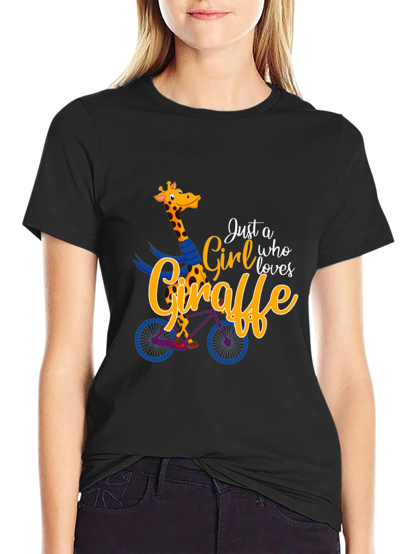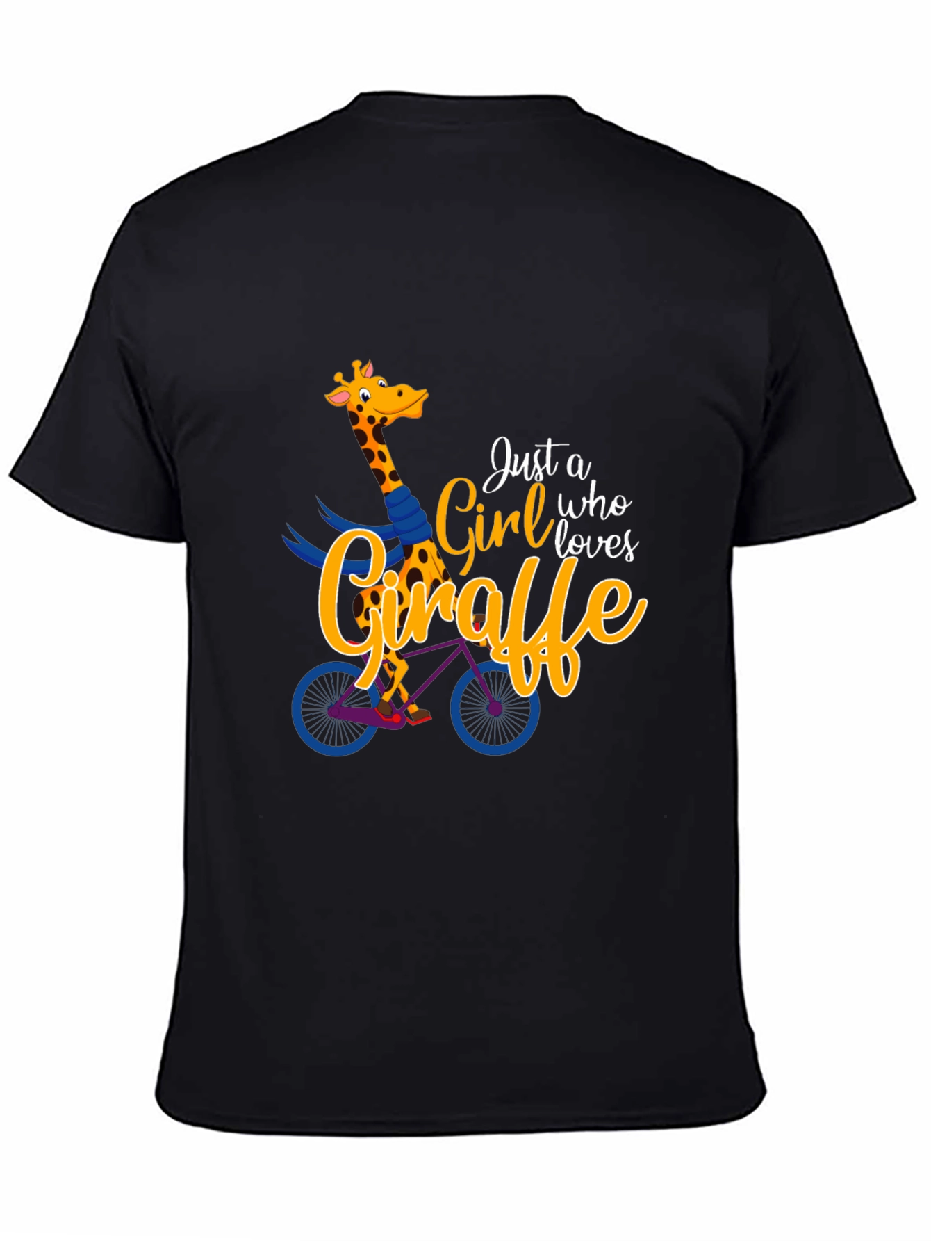 Showcase your love for giraffes with this unique black tee! Featuring a vibrant graphic of a giraffe riding a bicycle, paired with the playful text "Just a Girl who loves Giraffe." This tee is perfect for casual wear, animal lovers, or anyone looking to add a fun and quirky touch to their wardrobe. Made from comfortable fabric, this short-sleeve shirt is ideal for everyday wear. Stand out and express your passion with this charming giraffe-themed t-shirt!
