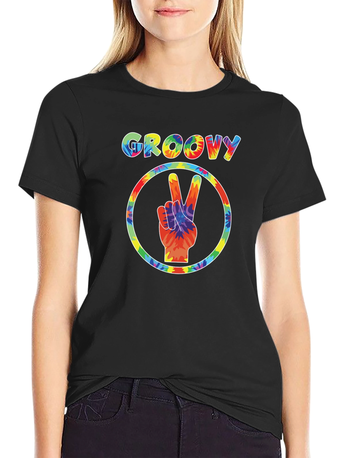 Spread peace and good vibes with this eye-catching black t-shirt featuring a vibrant tie-dye design. The word "Groovy" is emblazoned above a peace sign hand gesture contained within a circular tie-dye frame. The shirt is made from a comfortable-looking, breathable fabric. This classic fit tee is perfect for casual wear, concerts, festivals, or expressing your unique style. The colorful design is sure to turn heads and spark conversations. Embrace the retro aesthetic and add a touch of psychedelic flair to your wardrobe with this standout piece.
