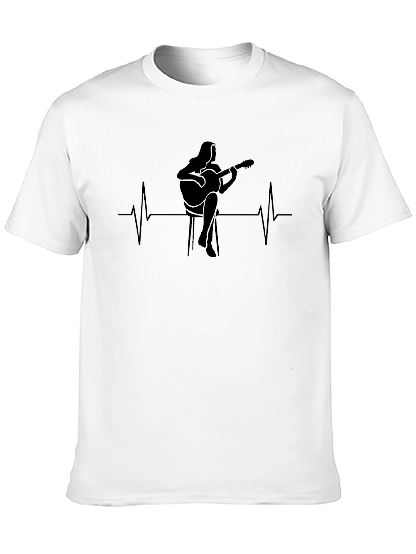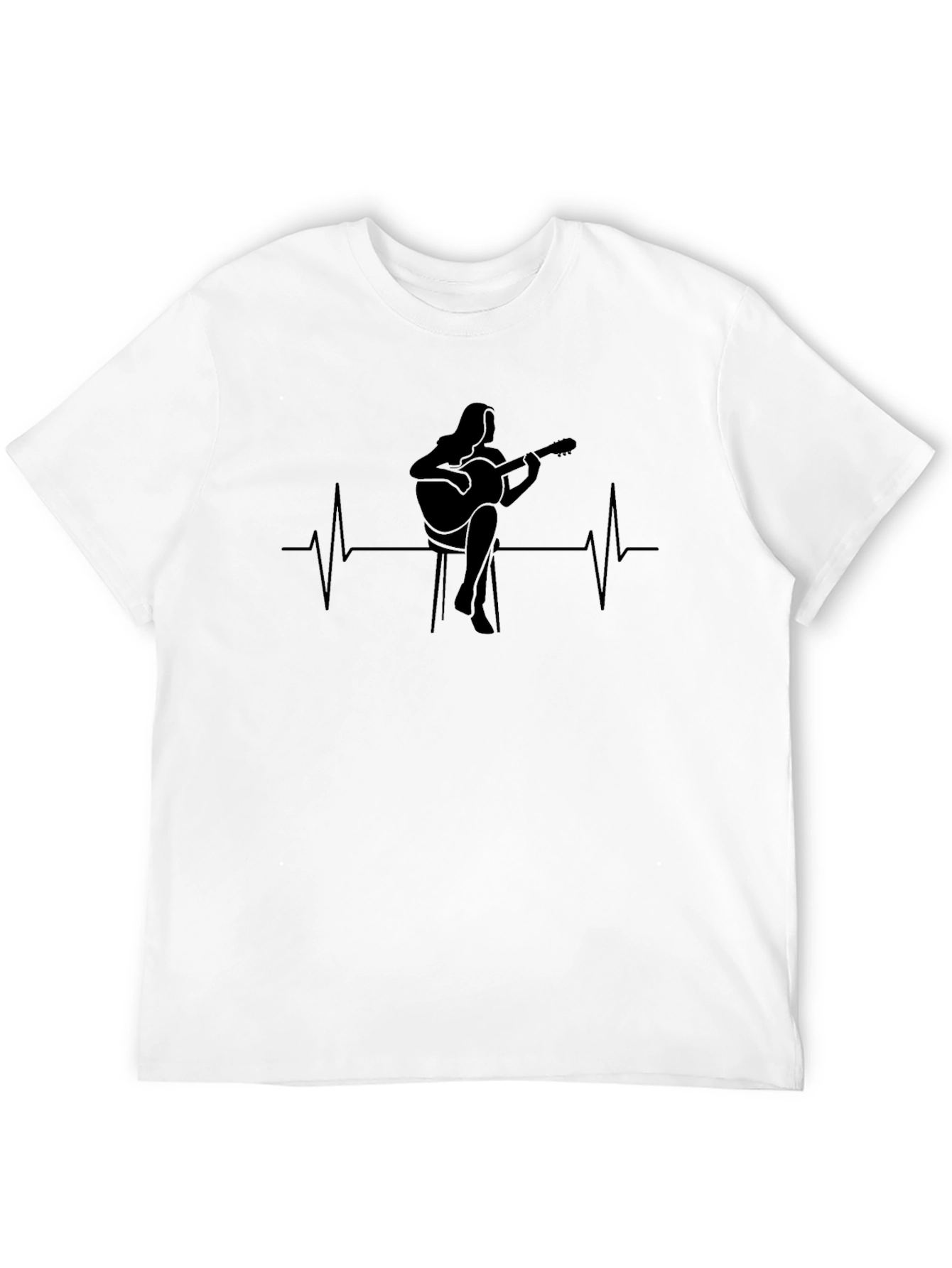 This stylish black t-shirt features a unique graphic design of a person playing guitar, incorporated into a heartbeat line. The simple yet artistic design is perfect for musicians and music lovers alike. Made from a soft, comfortable fabric, this tee is perfect for casual wear, concerts, or simply expressing your passion for music. The black color ensures it pairs well with any outfit. Whether you're a guitarist yourself or just appreciate good music, this shirt is a great way to showcase your interests and add a touch of personality to your wardrobe. Great as a gift for music teachers, guitar students, or fans of live music.