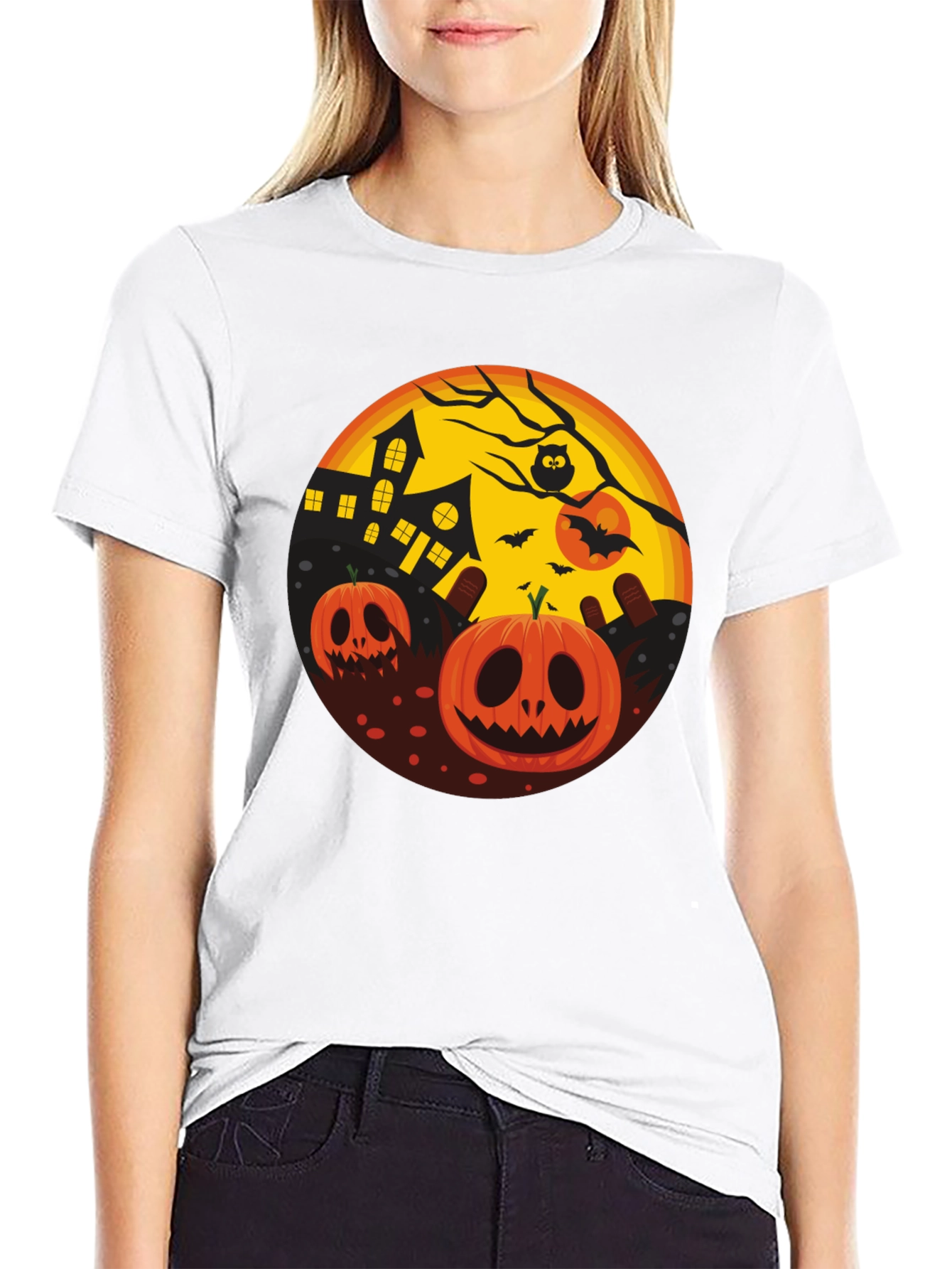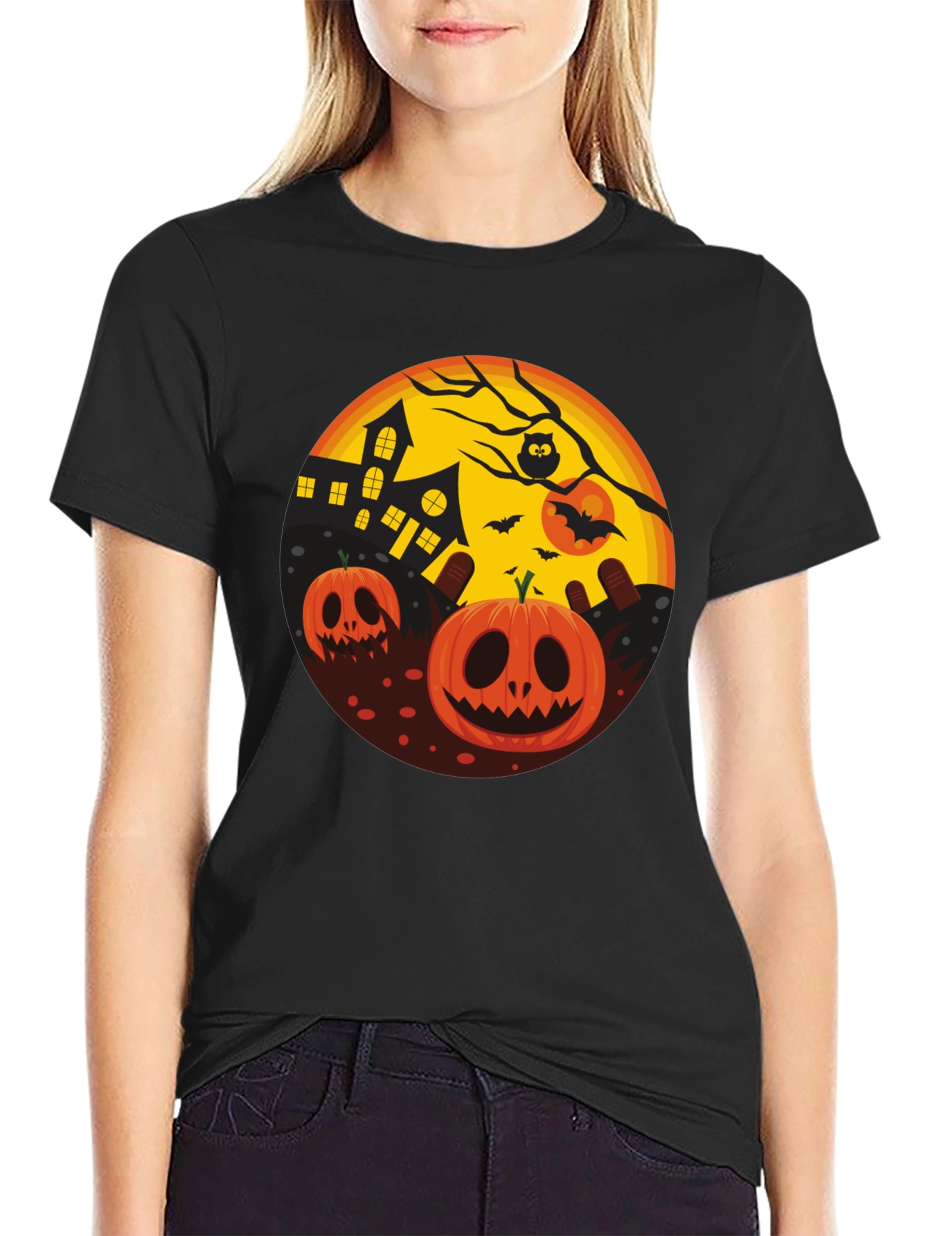 Embrace the Halloween spirit with this eye-catching black t-shirt. The design features a vibrant circular graphic on the front, showcasing a spooky Halloween scene. Two smiling jack-o'-lanterns, a haunted house under a full moon, bats, and a perched owl create a festive and slightly eerie ambiance. This tee is perfect for Halloween parties, trick-or-treating, or simply showing off your love for the holiday. The comfortable fit makes it ideal for everyday wear. Get ready to celebrate in style with this unique Halloween-themed t-shirt!