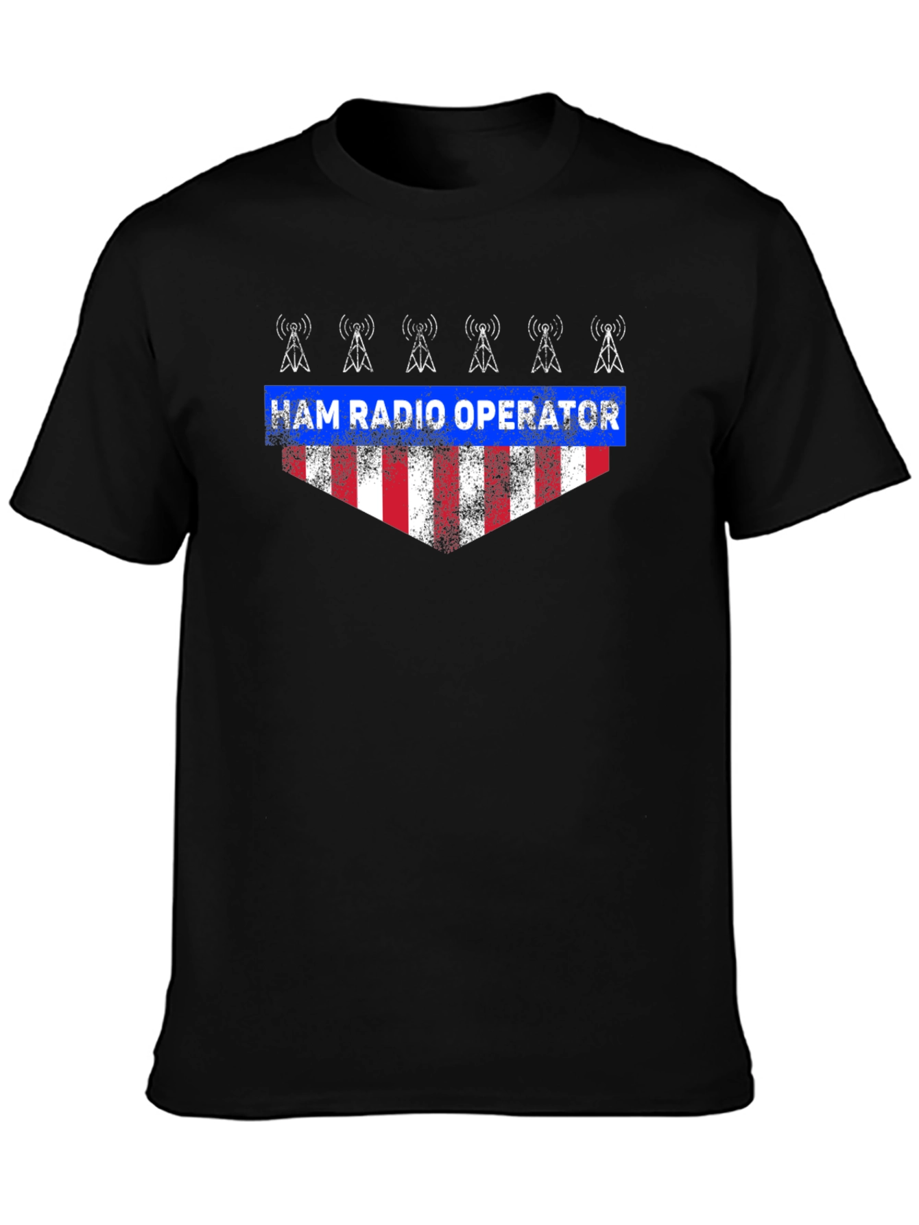 Show your love for amateur radio with this unique graphic tee. The black t-shirt features a distressed-style design of red and white stripes, topped with a blue banner that reads "HAM RADIO OPERATOR". Above the banner are five stylized radio towers. Made from a soft, comfortable fabric, this tee is perfect for casual wear or ham radio events. Ideal for amateur radio enthusiasts, this shirt combines style and passion in a standout design.