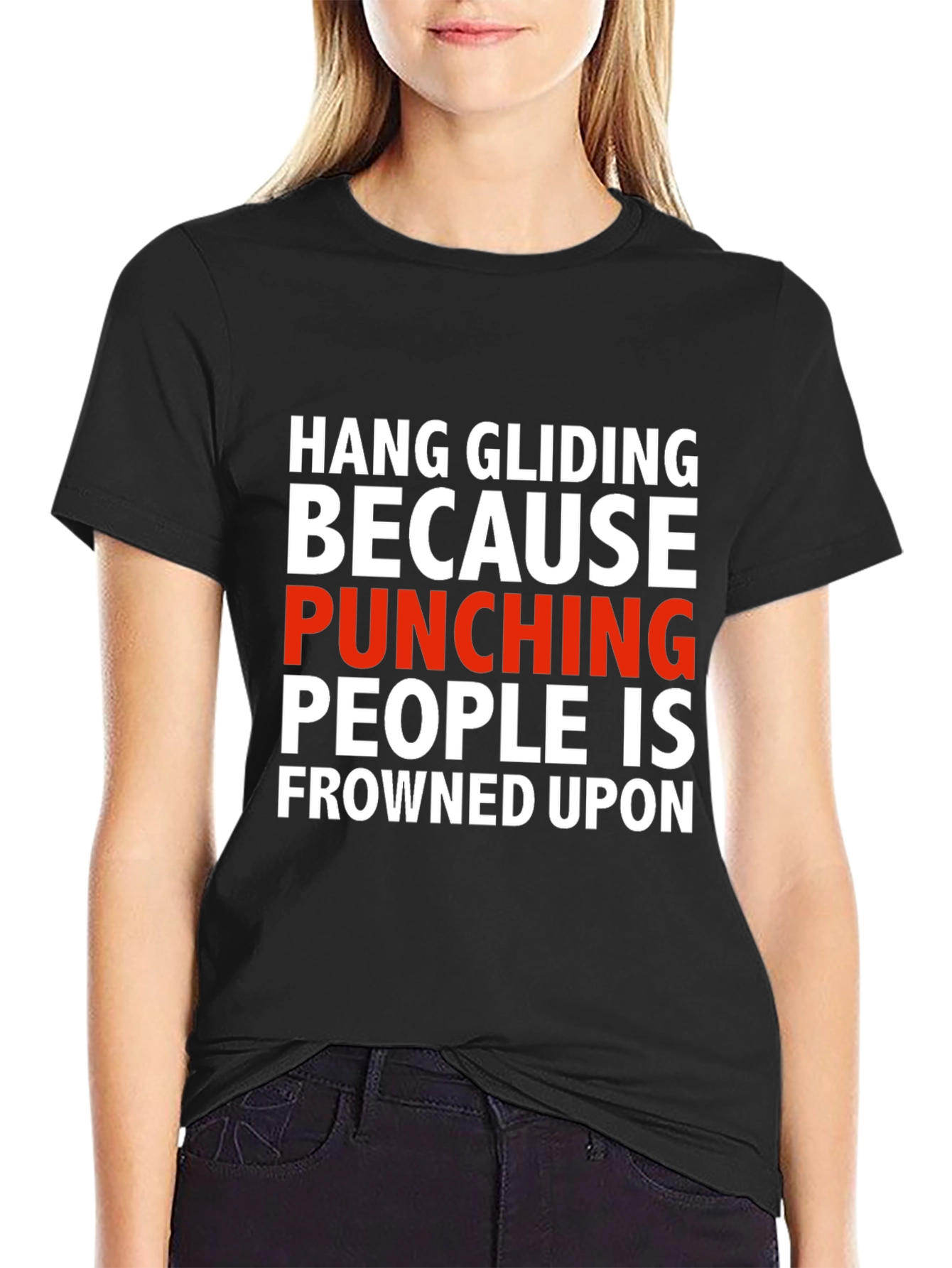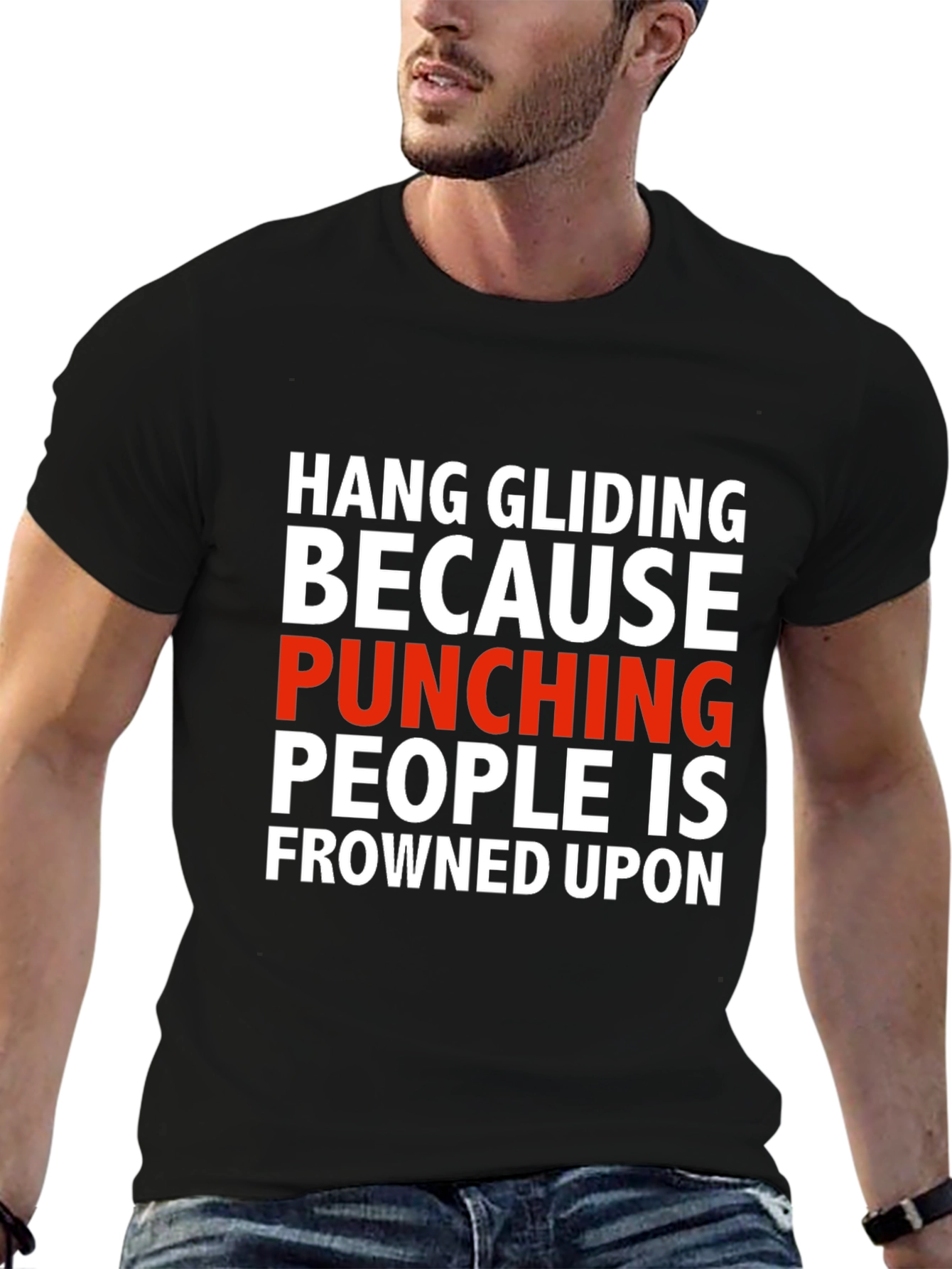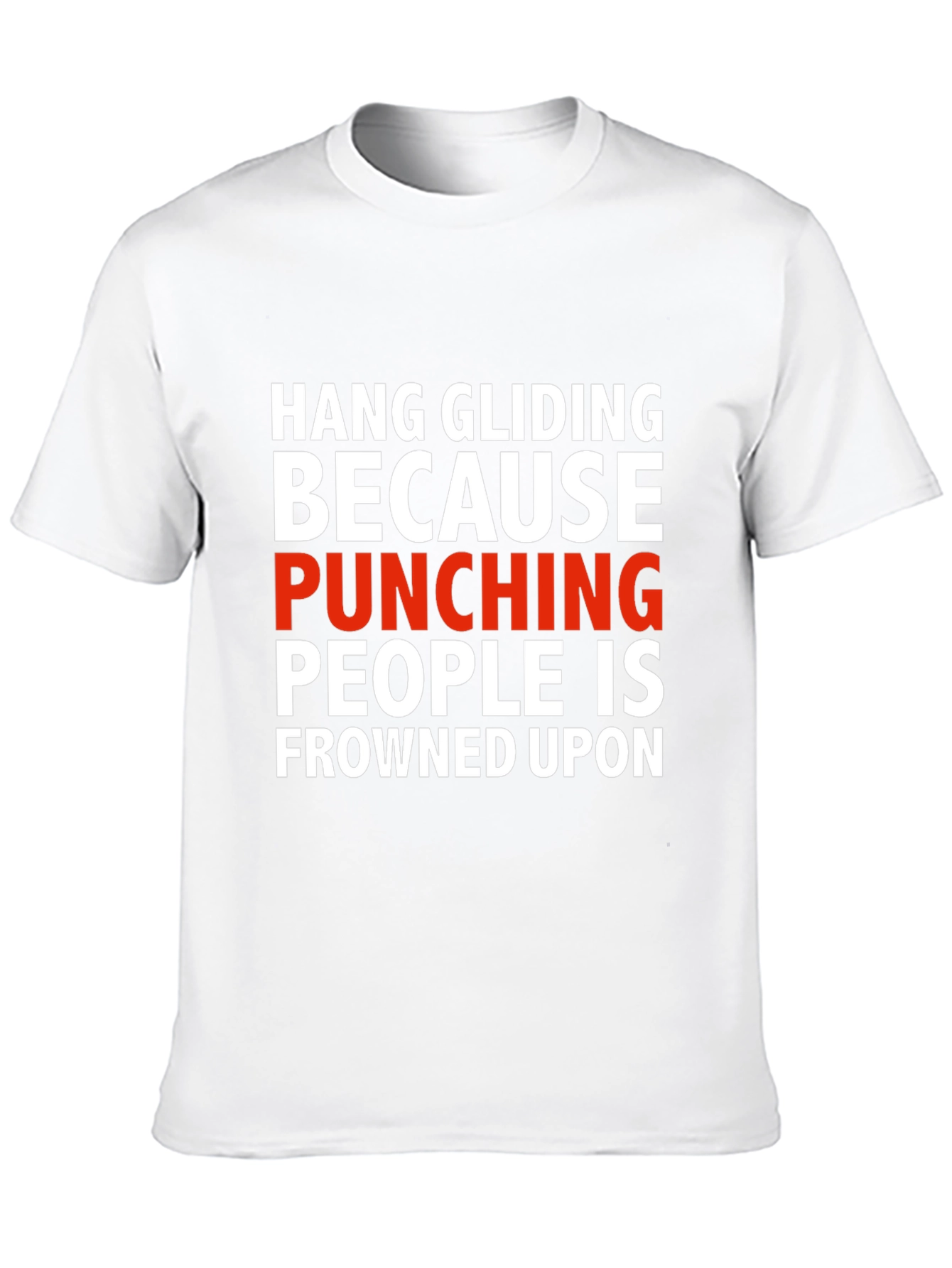 This eye-catching black T-shirt features a humorous statement in bold, contrasting white and red text: "HANG GLIDING BECAUSE PUNCHING PEOPLE IS FROWNED UPON". Made from what appears to be a comfortable, breathable fabric, this tee combines style and comfort. The short-sleeved design is perfect for casual wear, making it ideal for hang gliding enthusiasts with a sense of humor. Wear it to the airfield, casual outings, or simply to make a statement wherever you go! Makes a great gift.