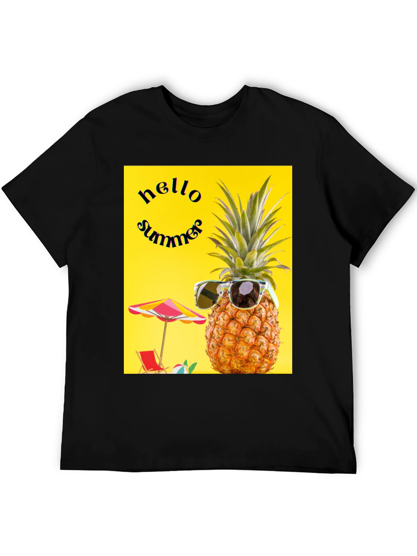 Embrace summer vibes with this unique black t-shirt featuring a vibrant 'Hello Summer' pineapple design. The eye-catching graphic showcases a cool pineapple wearing sunglasses, set against a bright yellow backdrop with a beach scene. Perfect for casual outings, beach trips, or summer parties, this tee combines comfort and style effortlessly. Stand out from the crowd and express your love for summer with this fun and trendy t-shirt.