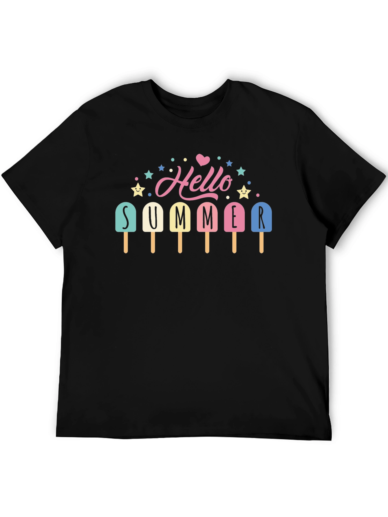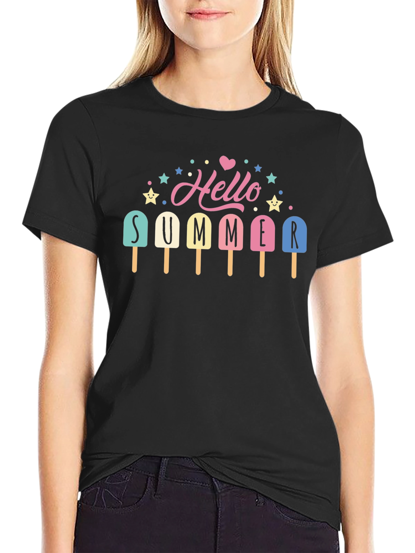 Embrace the summer vibes with this fun and colorful t-shirt! The design features the word 'Summer' illustrated as various flavored popsicles. 'Hello' sits on top in a playful script font with a heart and twinkling stars around it. This tee is perfect for casual outings, beach days, or any summer activity where you want to showcase your love for the season. The comfortable fabric makes it ideal for warm weather, ensuring you stay cool and stylish all day long. Grab this tee and make a splash wherever you go this summer!