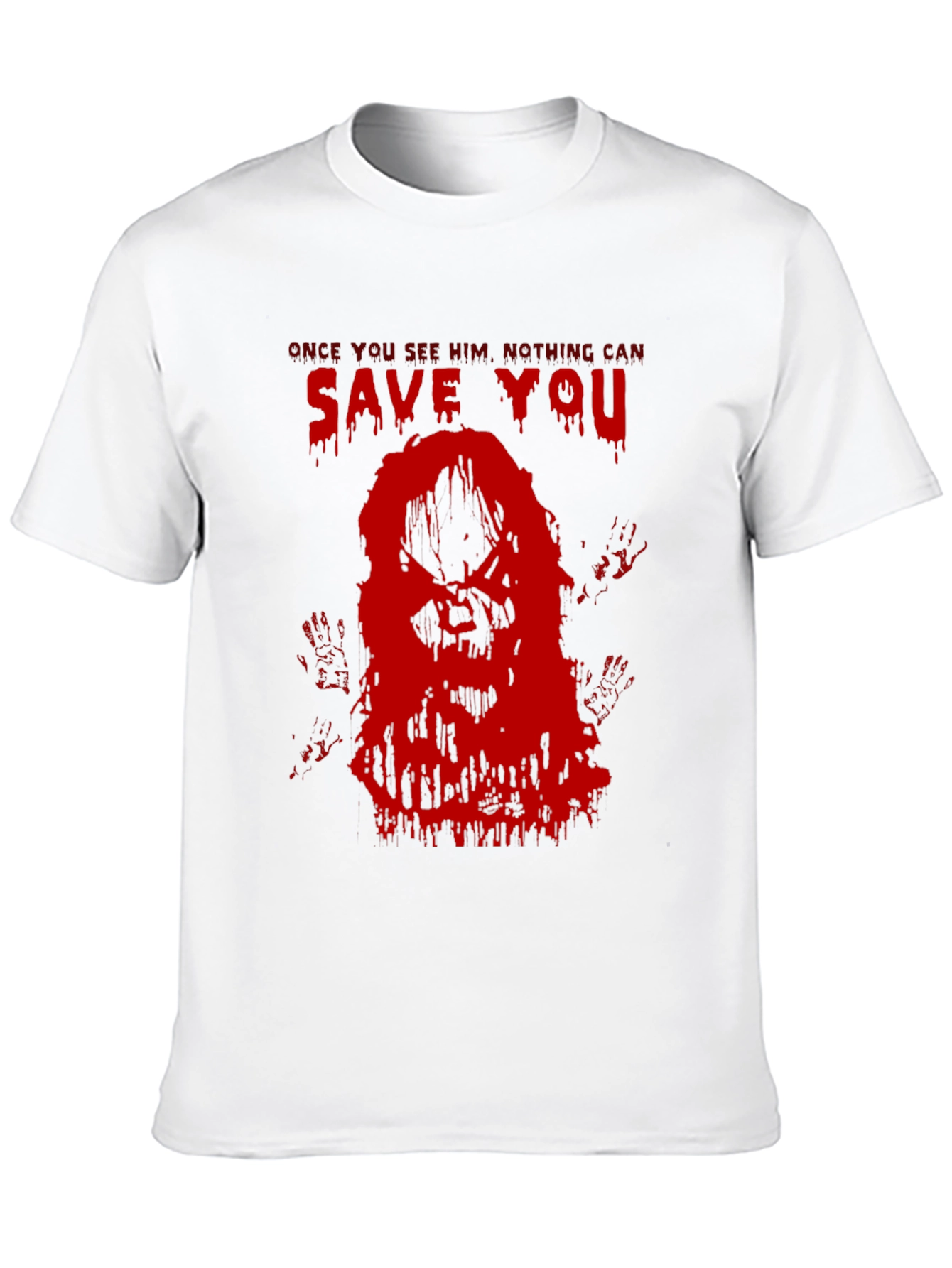 Embrace the thrill with this striking black graphic tee. Featuring a chilling red design of a horror-themed figure and the words "Once You See Him, Nothing Can Save You," this shirt makes a bold statement. The design is printed on a soft, comfortable fabric, perfect for casual wear or a night out with friends. Show off your love for horror movies and stand out from the crowd with this unique piece. Great for Halloween or any occasion where you want to add a touch of eerie style. A must-have for any horror enthusiast's wardrobe!