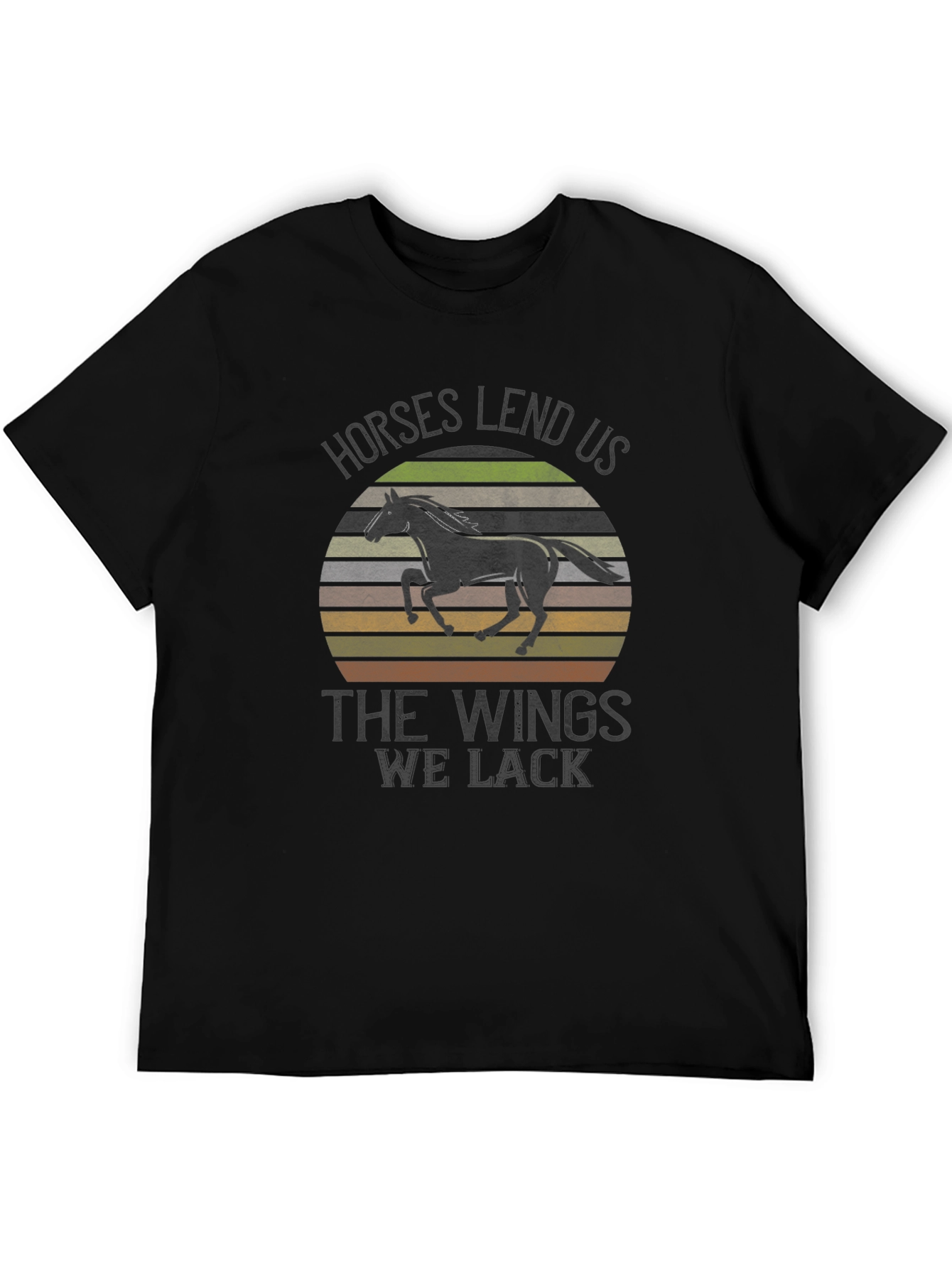 Showcase your love for horses with this stylish black t-shirt. The shirt features a striking graphic of a horse within a sunset-colored circle, complemented by the inspiring text 'Horses Lend Us the Wings We Lack.' Made from a comfortable fabric, this tee is perfect for everyday wear, equestrian events, or casual outings. Its eye-catching design is sure to spark conversations and display your passion for these majestic animals. A great addition to any horse lover's wardrobe!
