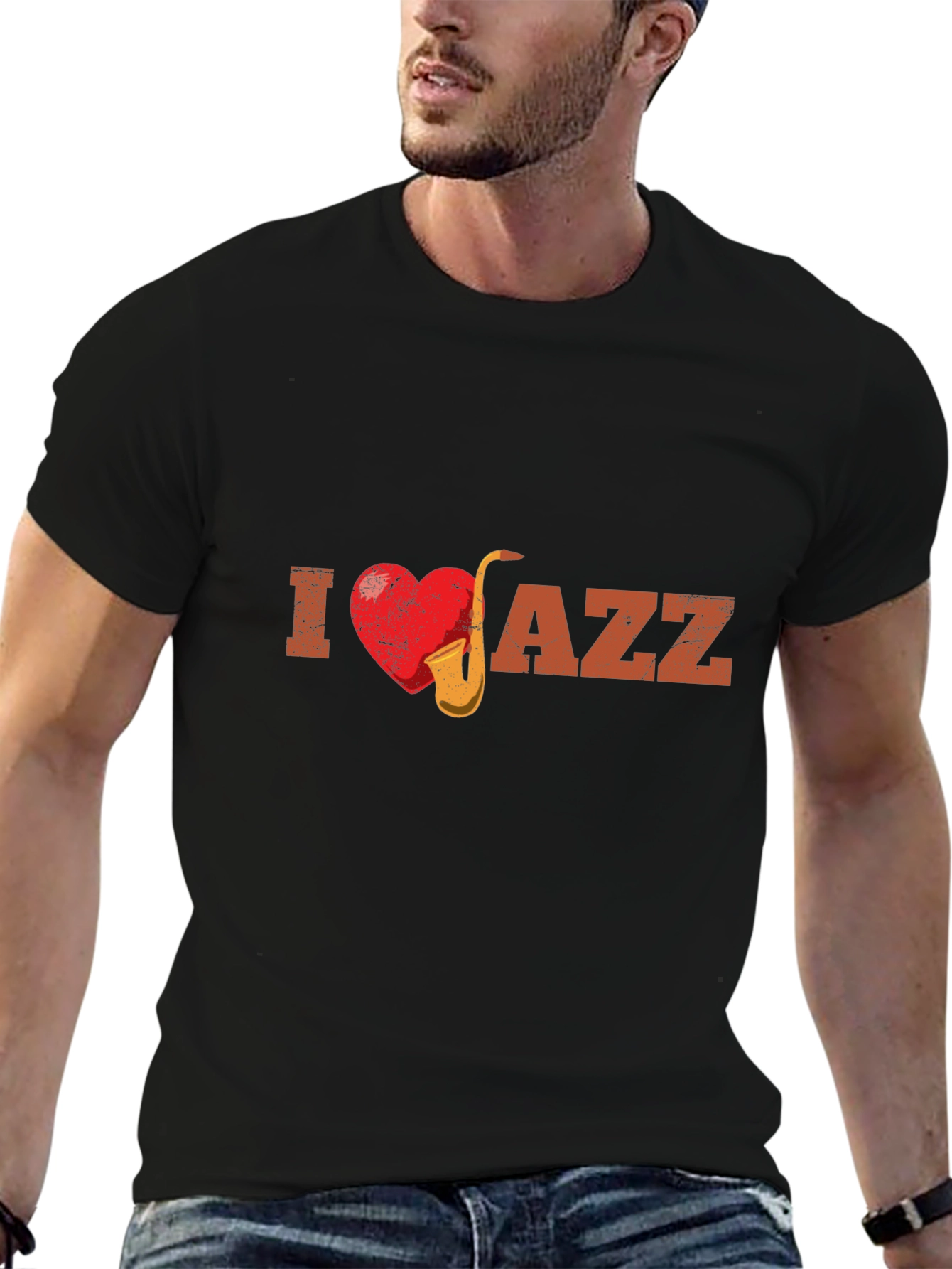 Show your love for jazz music with this stylish black t-shirt. Featuring a bold graphic design with a heart and saxophone replacing the "I", followed by the text "Jazz". This tee is perfect for jazz lovers and musicians alike. The design has a vintage distressed look, giving it a cool, timeless appeal. Made from a comfortable material, this t-shirt is ideal for casual wear, concerts, music festivals, or everyday style. A great way to express your passion for jazz music and add a touch of musical flair to your wardrobe.